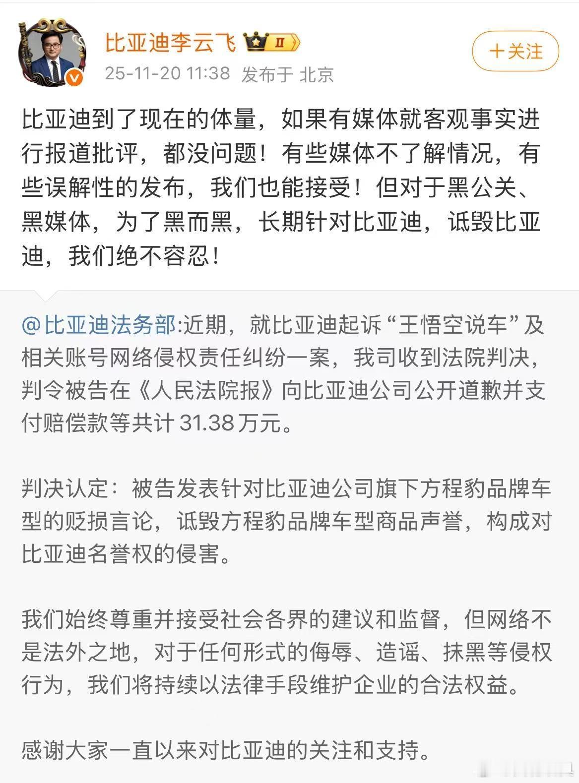 比亚迪起诉自媒体“王悟空说车”侵权案尘埃落定,11月20日比亚迪法务部公告显示,法院认定被告贬损方程豹车型言论侵犯企业名誉权,判令其公开道歉并赔偿31.38万元。此前该账号已因歪曲事实抹黑车企被网信办依法关停。比亚迪公关总经理李云飞明确表态,说比亚迪体量再大,也能理解部分媒体因不了解情况发的误解性内容,但那些黑公关、黑媒体为了黑而黑,长期盯着比亚迪诋毁,绝对忍不了。比亚迪多年提升悬赏打击黑公关,重拳维权既护自身权益,也助力净化行业生态,推动新能源汽车产业良性发展。