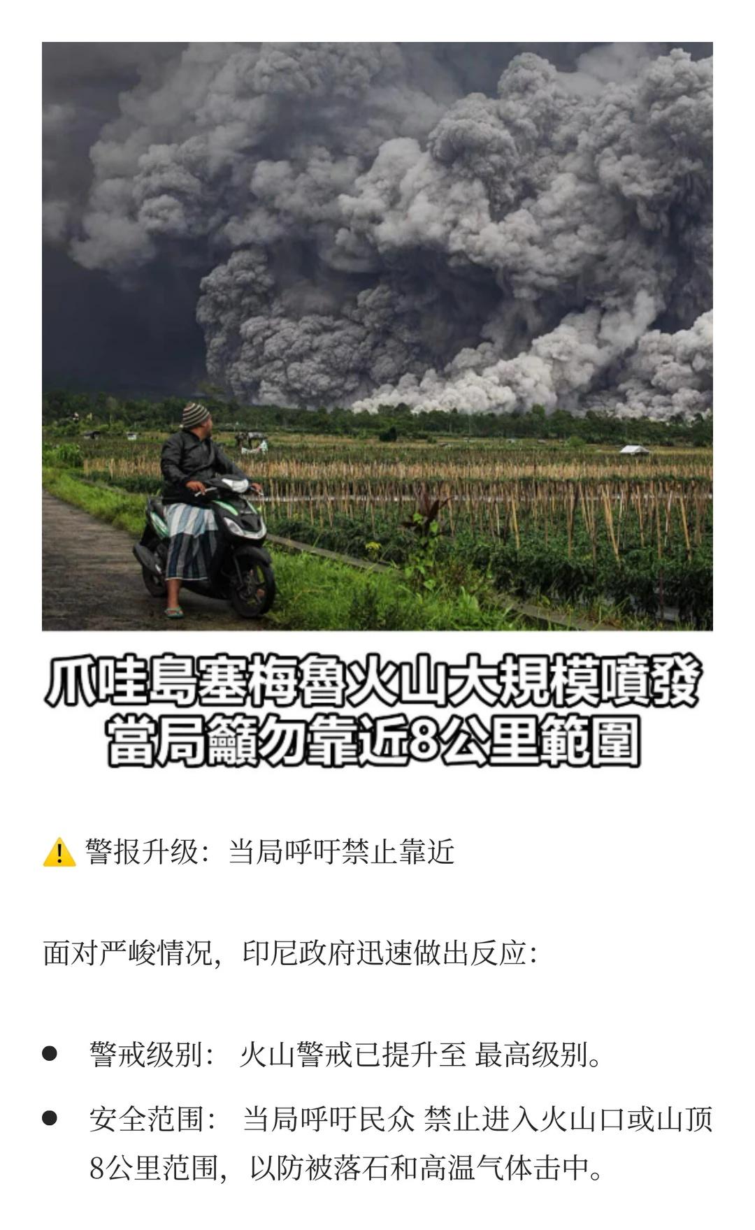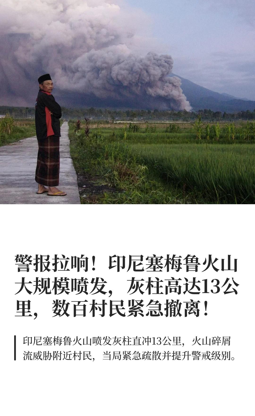 火山喷发!印尼呼吁民众勿靠近8公里范围 印尼爪哇岛东部塞梅鲁火山于19日发生大规模喷发,火山灰柱高达13公里,并喷出猛烈火山碎屑流。印尼政府已将火山警戒提升至最高级别,并呼吁民众禁止进入火山口或山顶8公里范围。当地至少有300名村民被紧急疏散至临时庇护中心,暂无人员伤亡报告。火山 地理科普 山火无情人有情 人类与自然灾害 气候变化 大自然敬畏