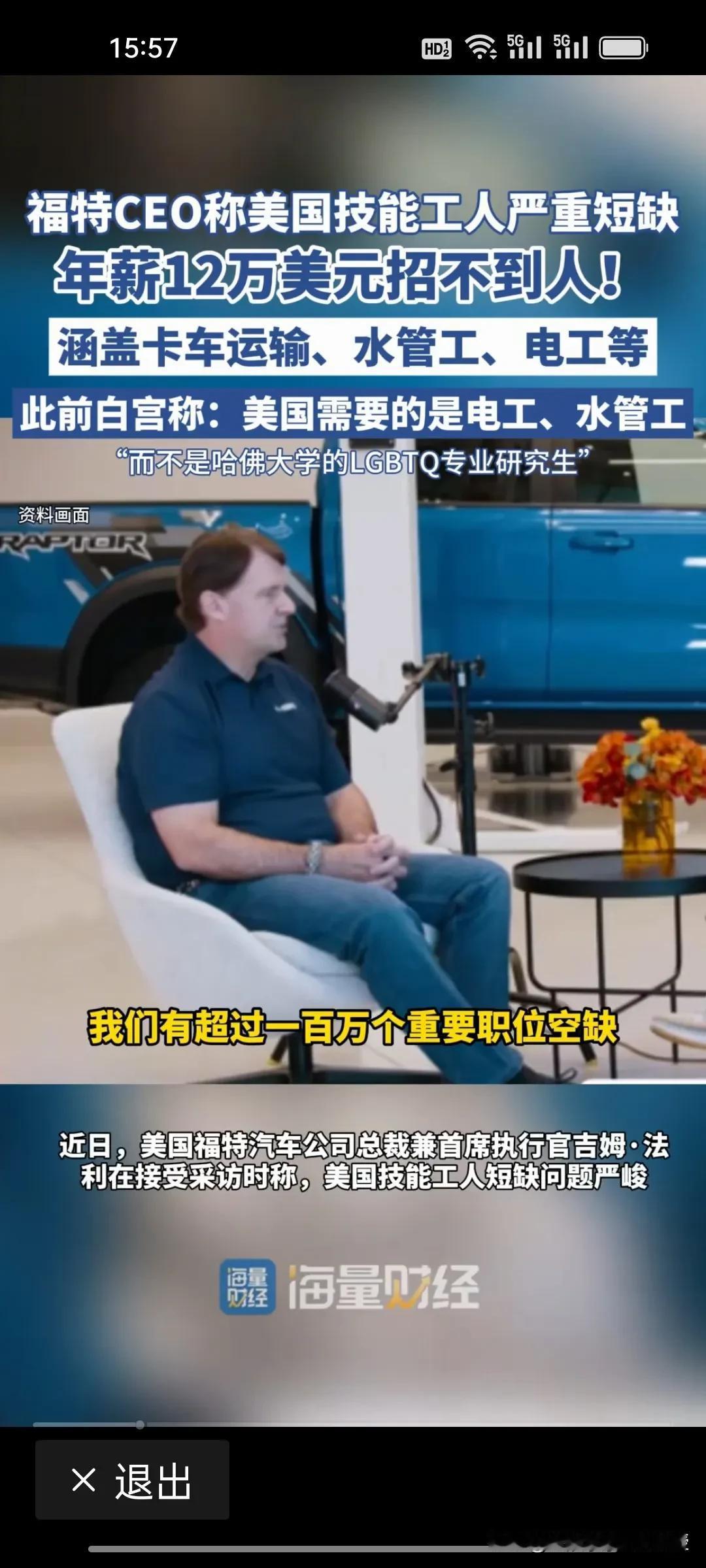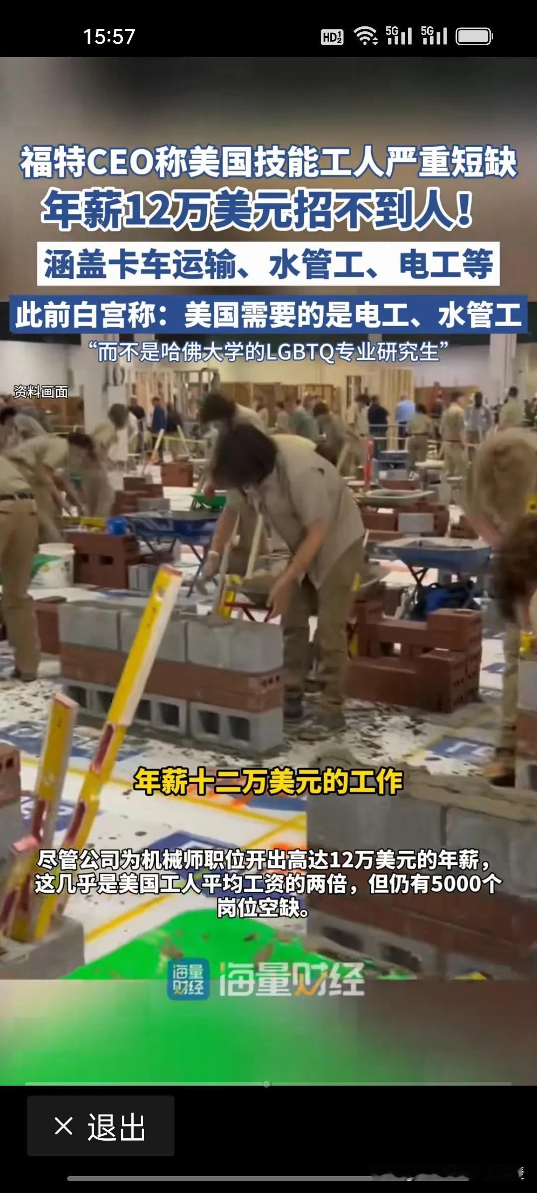 美国技能工人有多短缺?福特CEO称,自己公司年薪12万美元招机械师,目前还有5000个岗位空缺。特朗普很早就说过要让哈佛大学开技校,满足美国工人短缺的困境,这不是开玩笑。特朗普总是致力于制造业回流美国,全世界招商引资,但是摆在他面前的最大问题是投资找来了,没人来工厂干活。 美国关键岗位空缺高达100万个,电工,水管工,卡车运输,紧急服务等。 美国的蓝领平均年薪能达到4.3万美元左右,资深蓝领能达到年薪10万美元。卡车司机年薪平均都能超过5万美元。