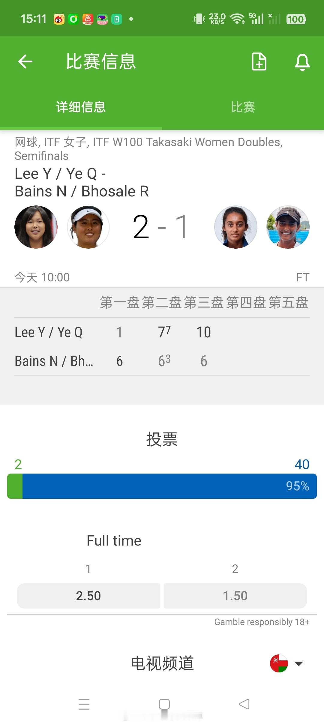 【🇯🇵高崎W100】女双半决赛🇨🇳叶秋语/李亚芯1-6/7-6(3)/10-6🇬🇧贝恩斯/🇮🇳B博霍塞雷收获65分 即时排名:🇨🇳叶秋语:259(+28)
