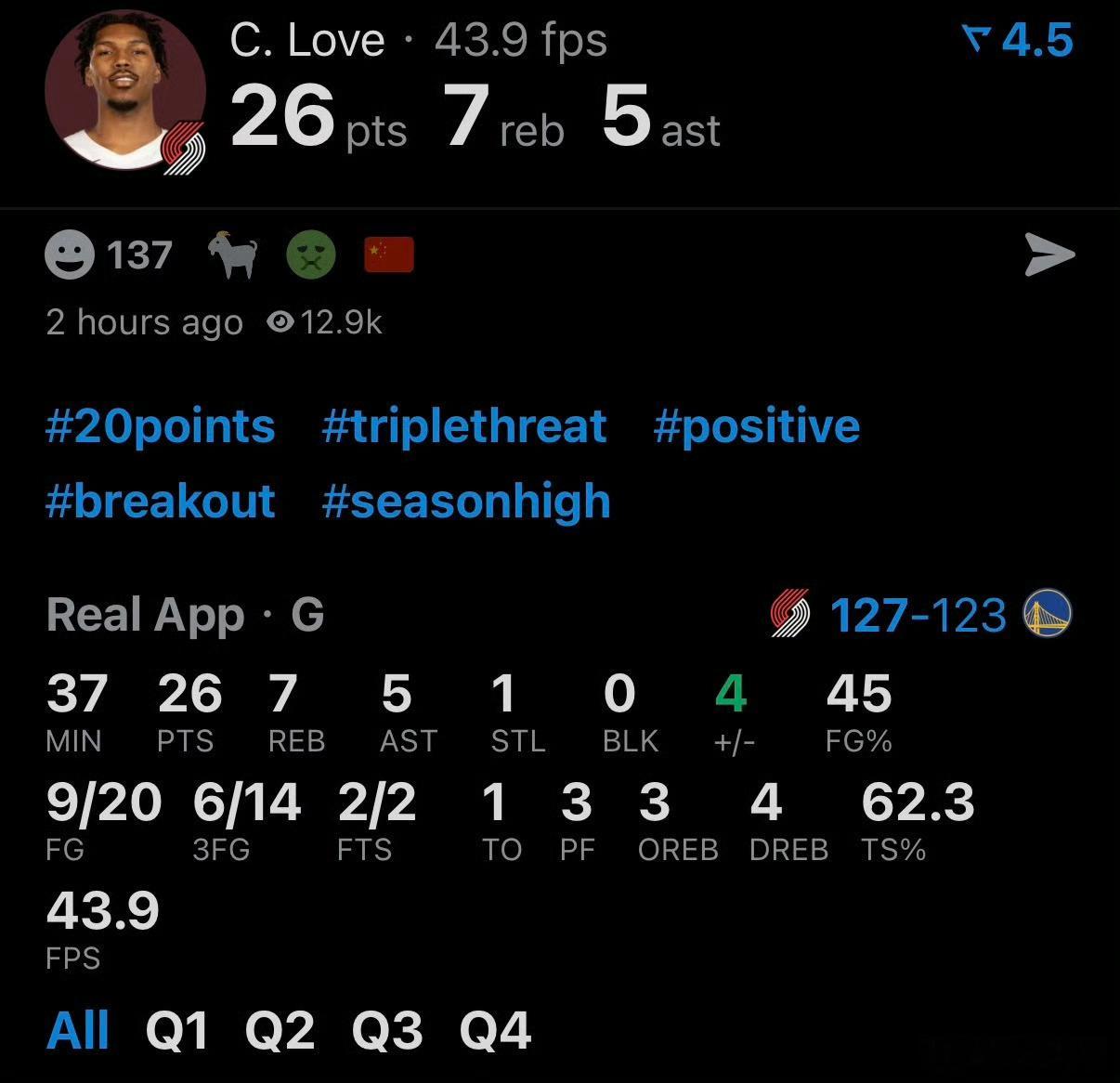 哥哥尽力了空砍38分,但不敌开拓者一个乐福爆种 双向合同乐福20中9,命中6记三分砍下26分7篮板5助攻。