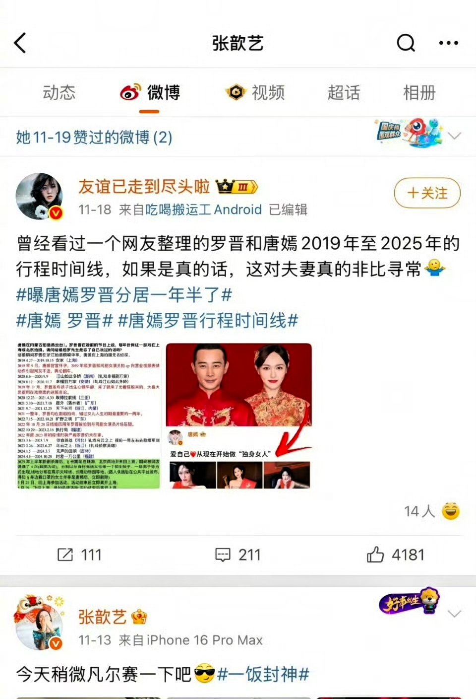 近日,有网友发现张歆艺竟然点赞了唐嫣和罗晋分居的信息,而且用的是自己的大号