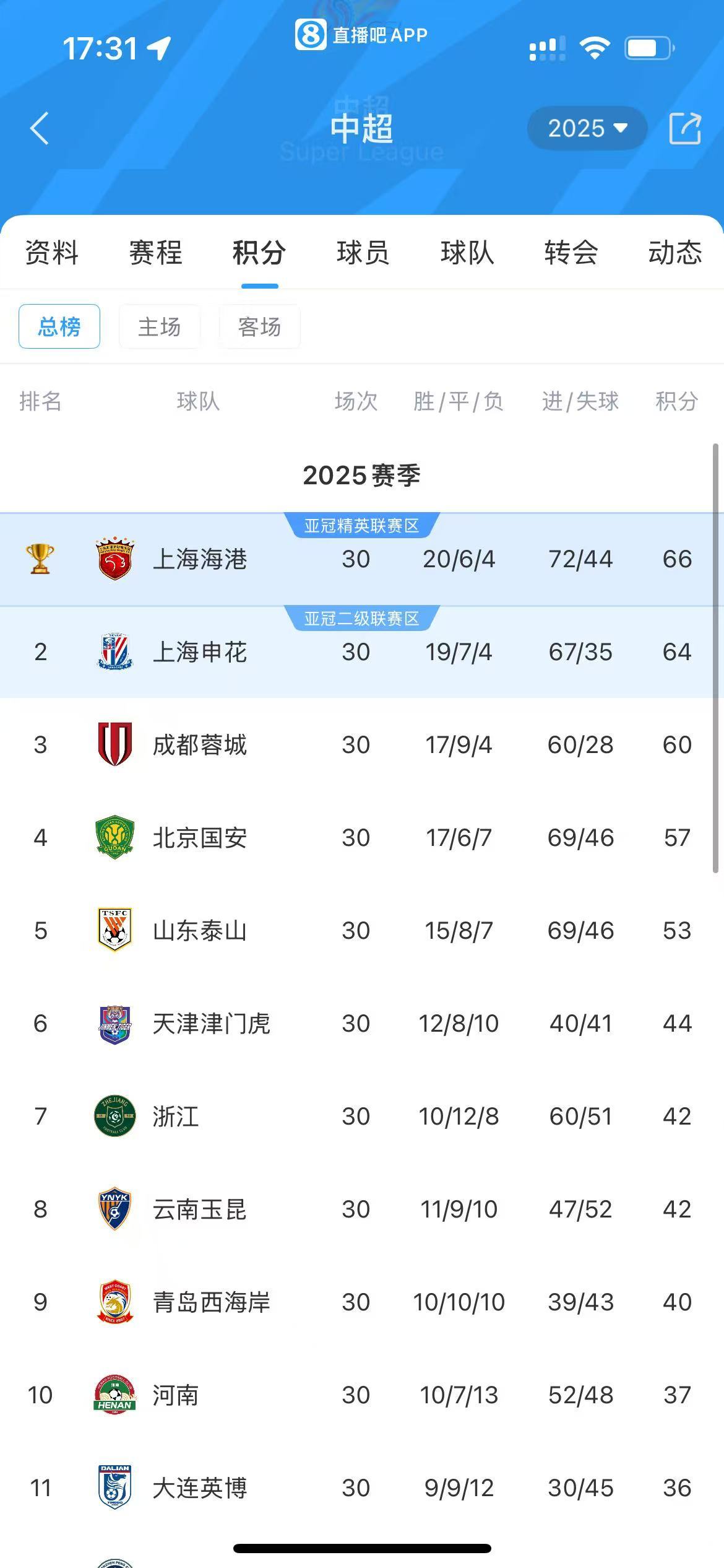 刚刚,本赛季最后一轮中超联赛8场比赛全部结束。30轮比赛过后,上海海港、上海申花、成都蓉城、北京国安、山东泰山、天津津门虎、浙江俱乐部排名前七位。巧合的是,2024赛季也是这七家俱乐部排名前七,且位次完全相同——可谓是一个“奇观”。