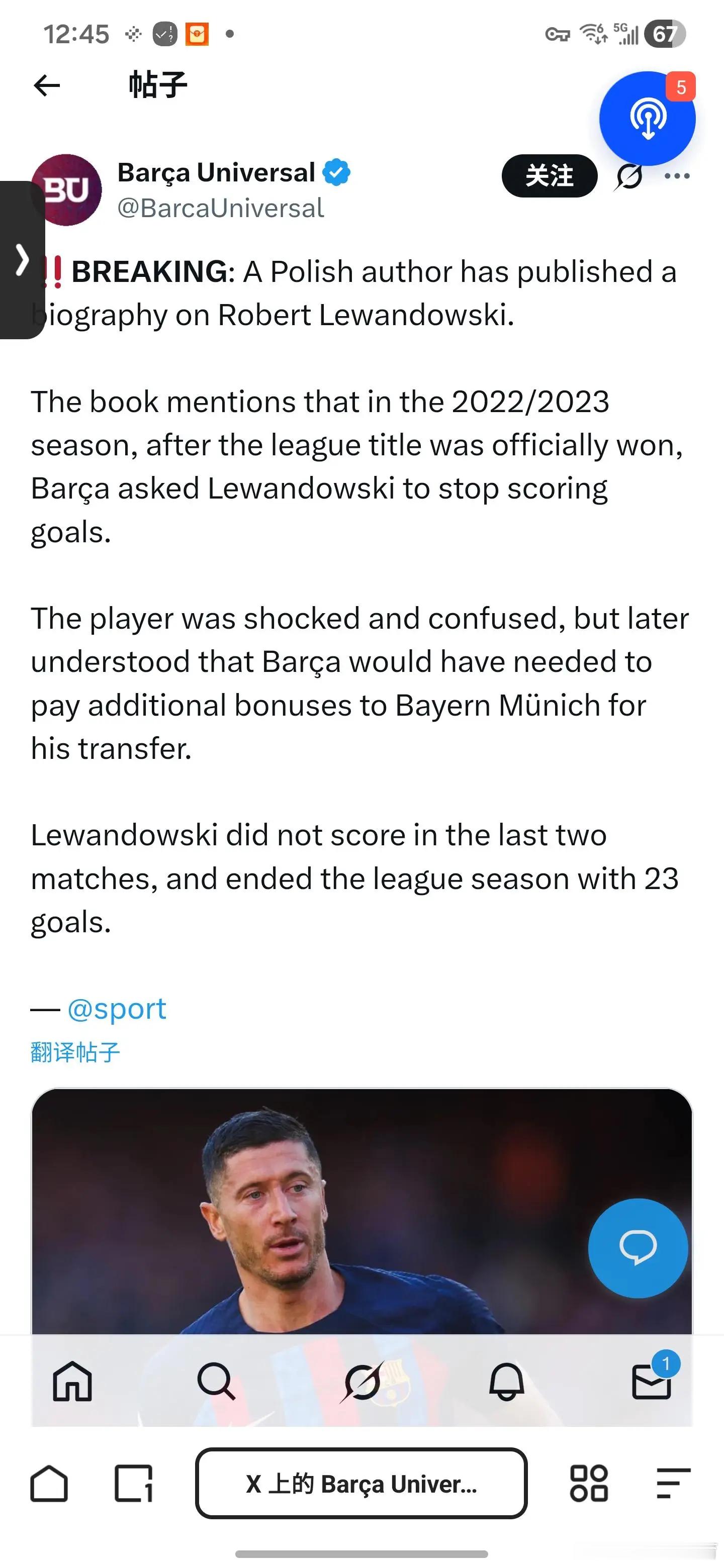 莱万:22-23赛季联赛打进23球后,拉波尔塔要求我最后两轮停止进球,因为进球少于25,巴萨可以少给拜仁250万