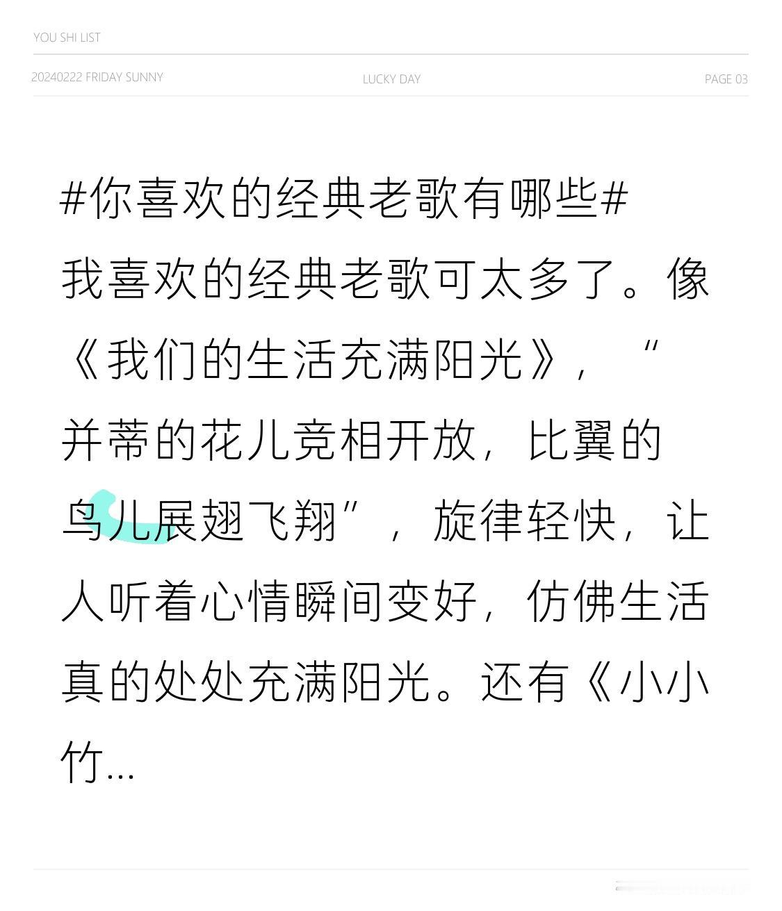 我喜欢的经典老歌可太多了。像《我们的生活充满阳光》,“并蒂的花儿竞相开放,比翼的鸟儿展翅飞翔”,旋律轻快,让人听着心情瞬间变好,仿佛生活真的处处充满阳光。 还有《小小竹排》,“小小竹排江中游,滔滔江水向东流”,简单的歌词勾勒出一幅生动的画面,让人感受到革命年代的激情与热血。 邓丽君的《月亮代表我的心》也堪称经典,她那温柔甜美的嗓音,将爱情的深情娓娓道来,不知打动了多少人的心。经典老歌就像一坛美酒,越品越有滋味。
