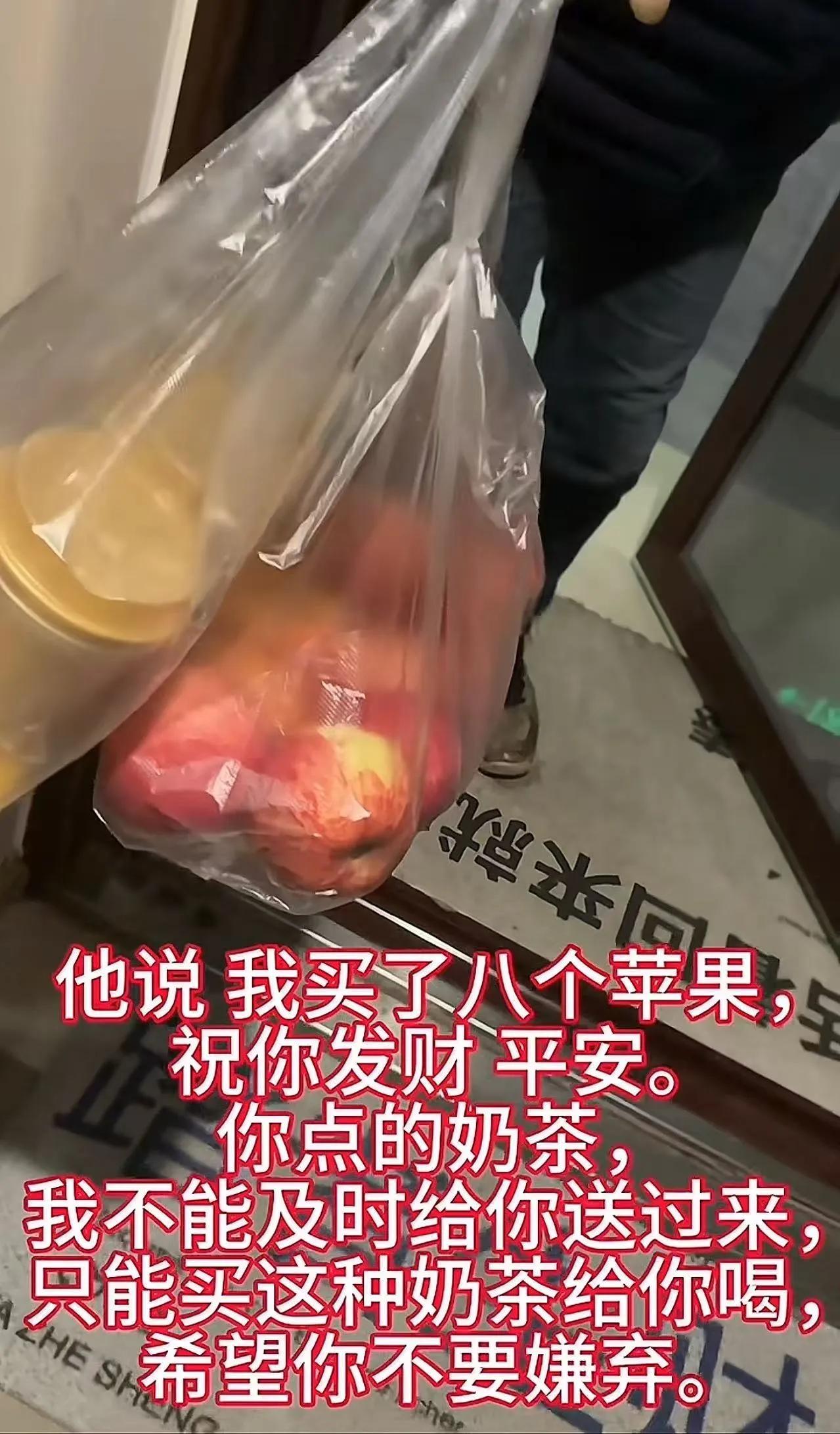 外卖员丢了电动车还哭着要赔奶茶钱,顾客一句话暖哭他! 傍晚女子点的奶茶迟迟没到,等来外卖员带着哭腔的语音,说车被偷没法送货,主动要赔钱。女子二话不说回电安慰,让他先找车,奶茶直接送他喝。 没成想当晚门铃响起,外卖员赶五公里路,提着两杯奶茶和八个苹果上门。车还没找到,却记着补心意,苹果寓意平安发财。 这双向善良跟小太阳似的,暖得人心里发烫!困境里的担当遇上无条件的体谅,果然最朴素的善意最打动人,谁看了不夸一句绝配~