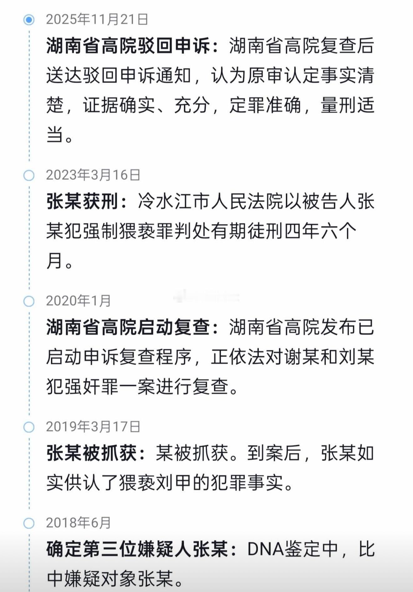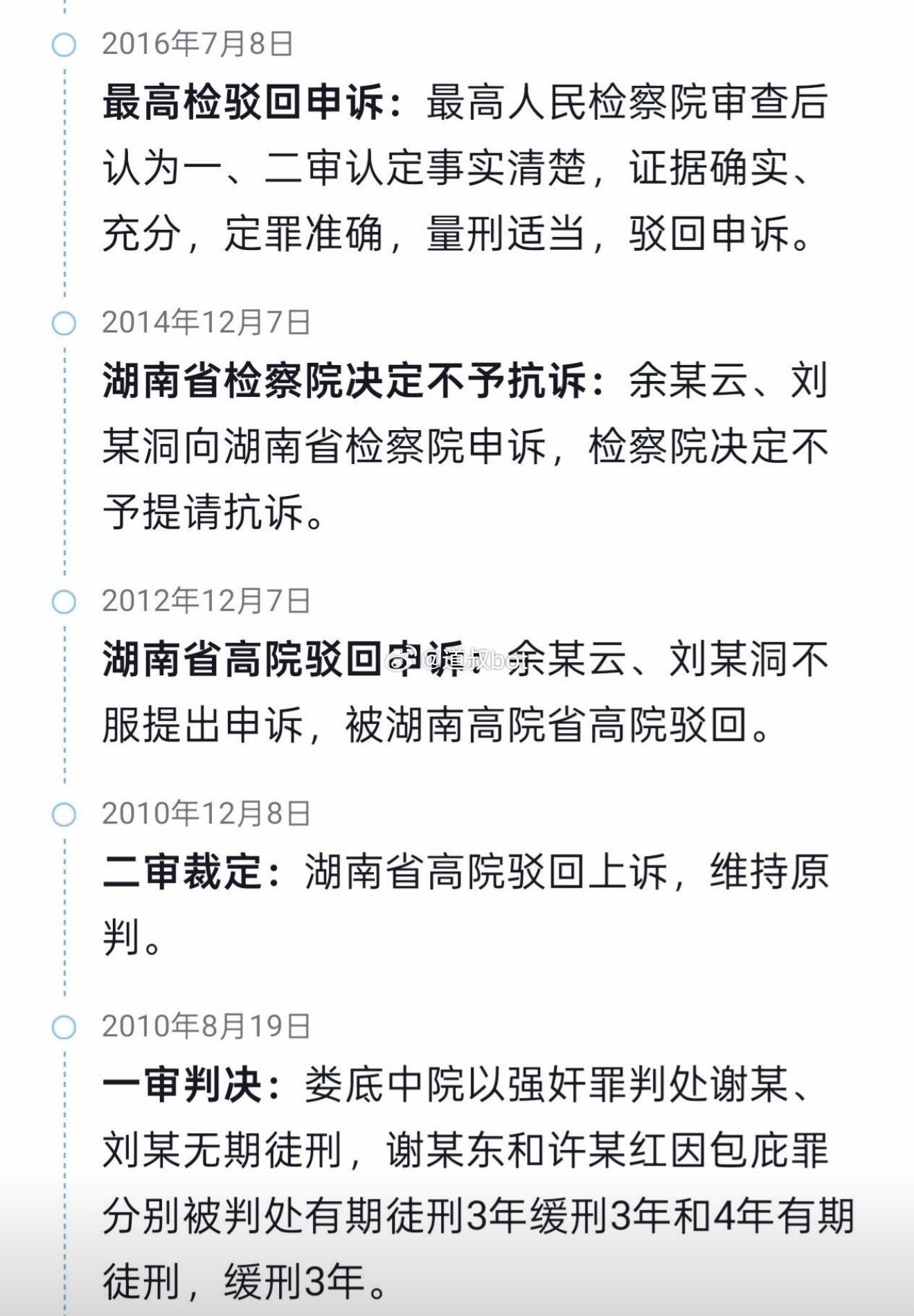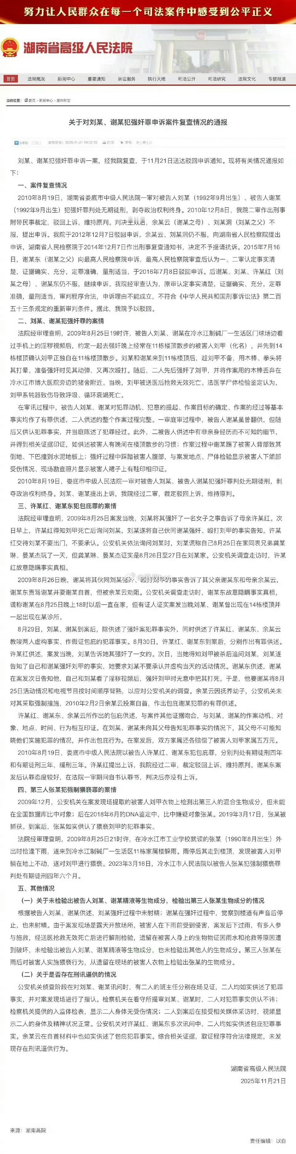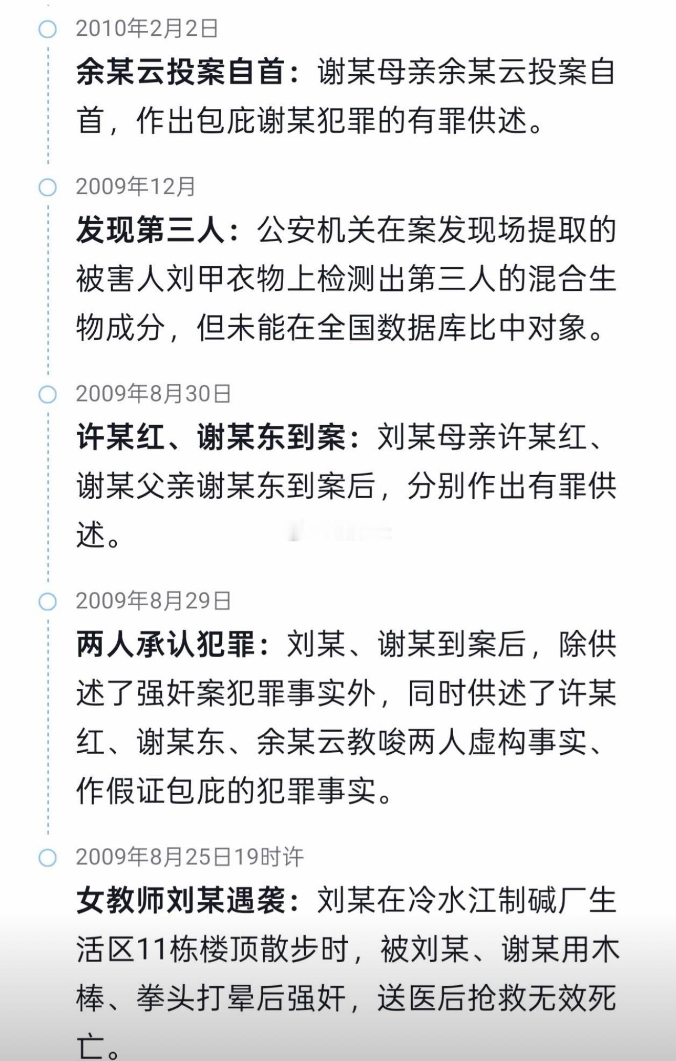 2009年8月25日晚,湖南冷水江制碱厂生活区发生两高中生奸杀女教师案,具体经过如下(法院查明版本):案发当晚1. 19时许,17岁的刘某、谢某在生活区门球场边看手机淫秽视频后,预谋强奸常在此处11栋楼顶散步的女教师刘甲(化名),先到14栋楼顶确认刘甲独自在11栋楼顶 。2. 二人携木棒潜入11栋楼顶,趁刘甲不备以木棒、拳头将其打晕;见其动弹又再次殴打,随后先后实施强奸 。3. 作案后,二人丢弃木棒于博大医院旁猪舍附近,逃离现场 。当晚刘甲被发现送医,因钝器致伤引发呼吸、循环衰竭抢救无效死亡 。4. 后续查明,当晚约21时,第三人张某躲雨至该楼栋,发现倒地的刘甲后实施猥亵,其行为与死亡无关,后被另案处理。案发后与司法进程,二人回家后告知家长,家长教唆串供、虚构不在场证明,后因包庇罪被判刑。警方侦查中,二人作出有罪供述,细节与现场勘查、尸检高度吻合(下颌伤、裙子鞋印等),审讯有班主任见证,入监体检无刑讯痕迹。2010年8月娄底中院一审以强奸罪判处二人无期徒刑,同年12月湖南高院二审维持原判;后续多年申诉均被驳回,2025年11月湖南高院再次驳回再审申诉 。最后,天网恢恢,疏而不漏,莫伸手,伸手必被捉。