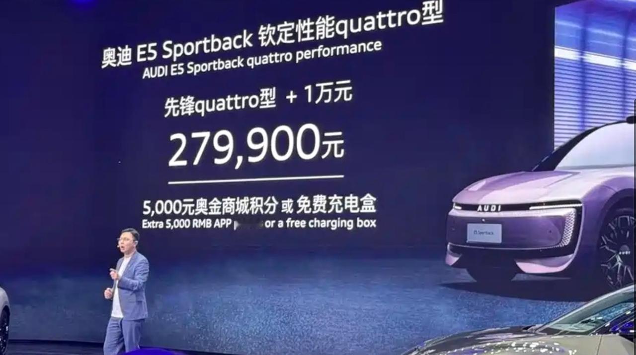 奥迪E5 Sportback性能版上市,杀到27.99万[哆啦A梦吃惊] 双电机四驱 386kW/725N·m,破百仅需3.9秒! 83度电池,CLTC纯电570km,10%-80%快充≤35分钟 标配空气悬架+CDC+后轮转向,奥迪是把看家本领都掏出来了? 智驾用的Momenta方案+27个感知硬件(含激光雷达),支持高速+城市道路辅助驾驶 尺寸4870/1990/1460mm,轴距2950mm,妥妥的中大型轿跑身段 奥迪这波操作,有点意思。27.99万,能买到3.9秒破百、空气悬架、后轮转向的豪华品牌纯电轿跑,还要啥自行车?[666] 这是被新势力“卷”怕了,还是电动化转型的“诚意之作”? 你觉得这波奥迪E5 Sportback性能版香不香?[吃瓜群众]