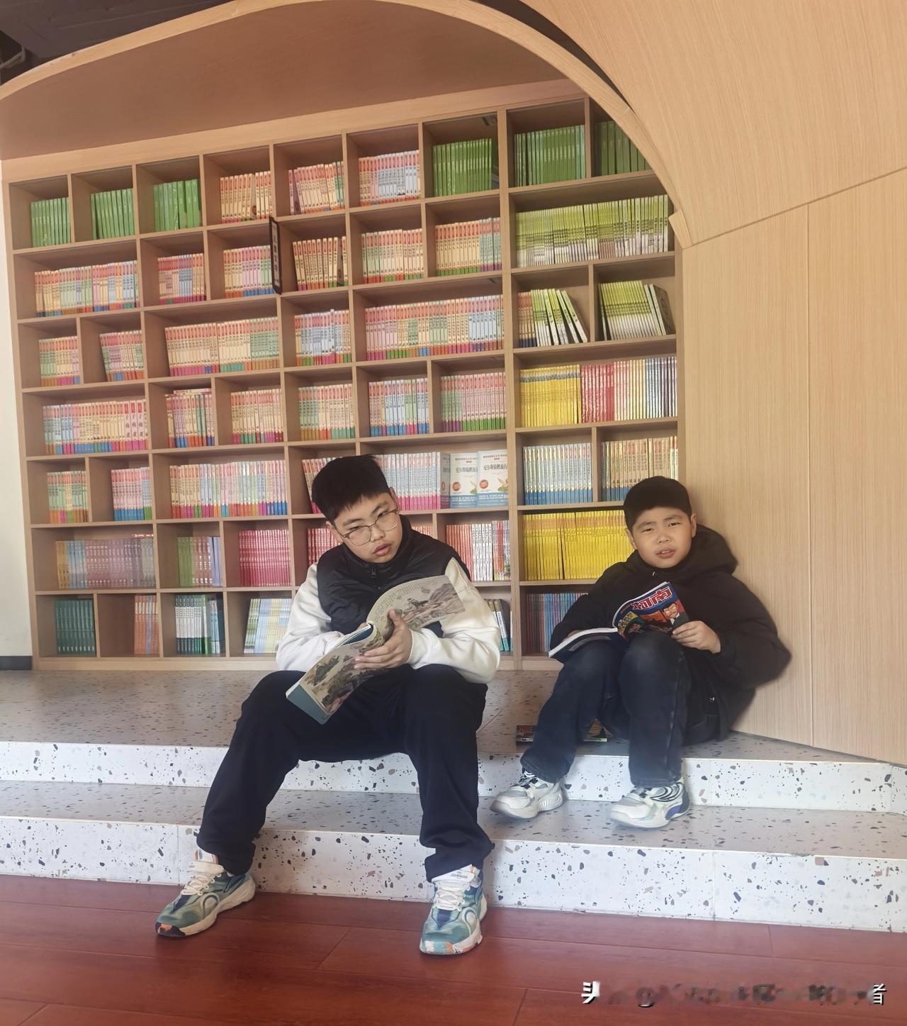 今早拽着俩精力旺的娃奔了图书馆,本怕他俩吵吵,一进门他俩先扎进书架堆里挑书——哥哥扒着层板抽书,哗啦带落本漫画,弟弟眼疾手快接住,本来皱着眉要嘟囔,瞥见封面上的机器人,立马把书往对方怀里塞:“这个我看过!比你那本绘本酷!”末了还凑过去指着页脚小彩蛋,声音压得像偷糖吃的小老鼠。 挑好后他俩蹭蹭坐定书架旁的台阶翻书,身后满架书花花绿绿堆着,一个捧着厚绘本眯眼瞧细节,另一个捏着漫画抿嘴笑,连鞋底沾的光斑都静悄悄的。原来不用催“安静”,书自会把他们的闹劲儿裹成软乎乎的专注,这比啥说教都灵。