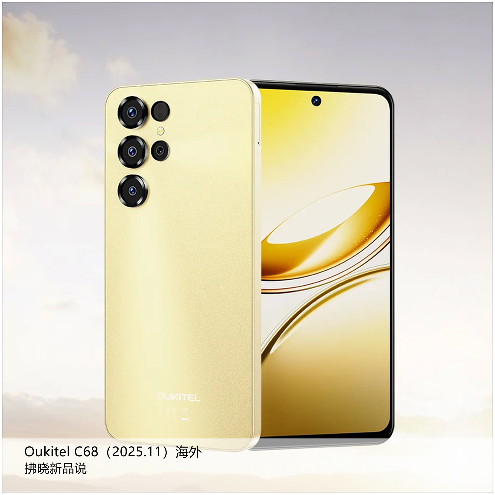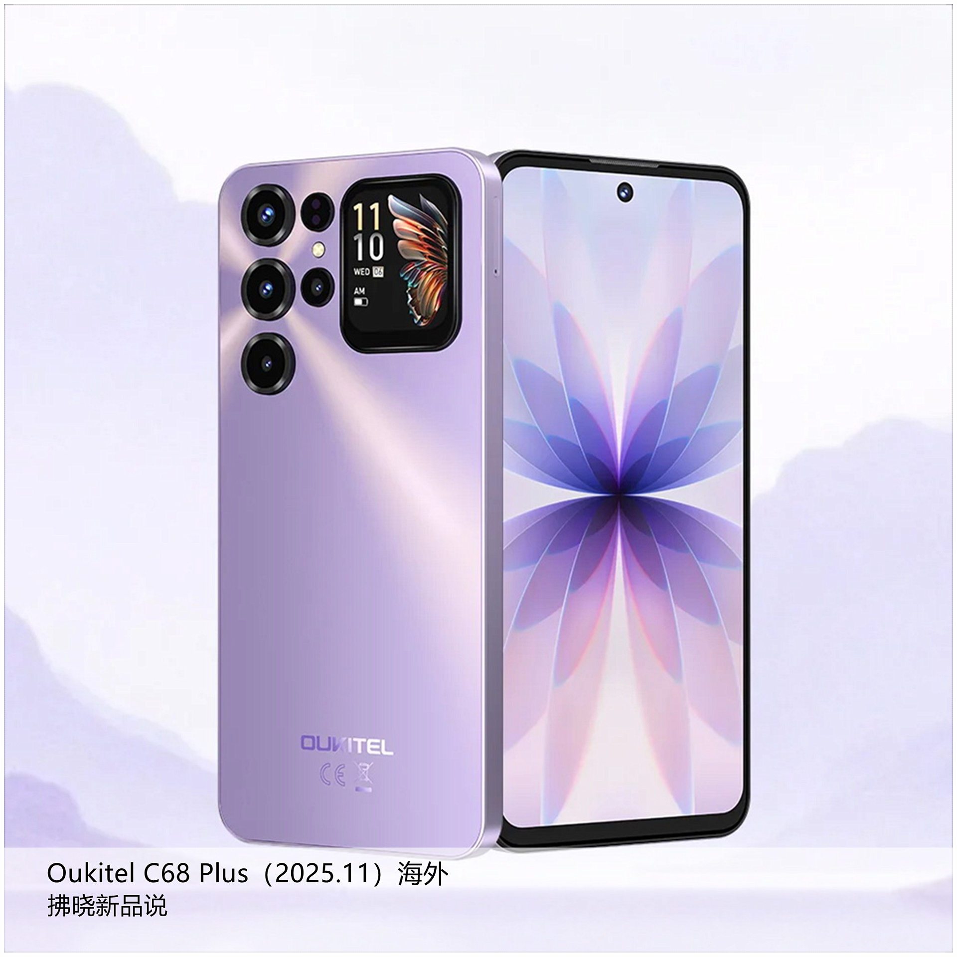 【拂晓新品说】Oukitel C68(海外):- 发布时间:2025年11月;- 处理器:紫光 展锐T615;- 存储:LPDDR4X+UFS 3.1;- 屏幕:7.2英寸LCD居中打孔屏、1560×720分辨率、120Hz屏幕刷新率、239 PPI、500nits峰值亮度;- 影像:后置6400万像素镜头(f/1.8)+8万像素辅摄(?)“双摄”,前置800万像素镜头(IMX219PQ、f/2.0)“单摄”;- 续航:6000mAh电池+18W有线充电;- 其他:侧边指纹识别、NFC、支持Micro SD卡扩展(至高1TB);预装基于Android 15的操作系统,机身厚度约9.5mm,净重约243g;始发“黑色、蓝色、金色、紫罗兰”四个版本,全系约1636起(8GB+512GB)。- Oukitel C68 Plus(海外):机身背部增加一块副屏(1.81英寸、240×284分辨率),机身厚度约9.4mm,净重约245g,全系约1758起(4GB+128GB)。★注:相关数据源于网络,不同地区版本或略有差异,最终以官方信息为准。