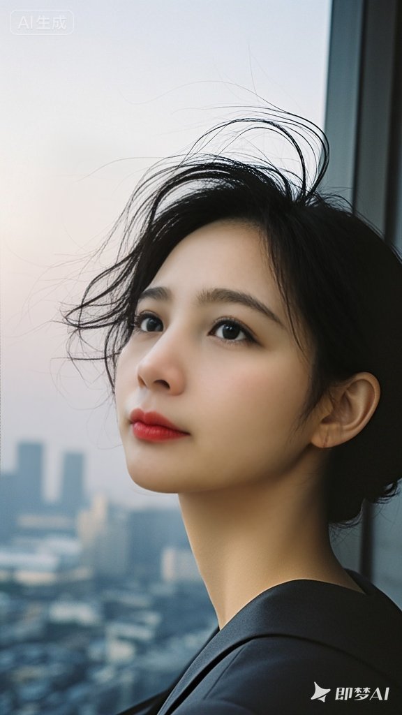 都市女郎的沉思瞬间,窗外的城市与内心的世界交织。
