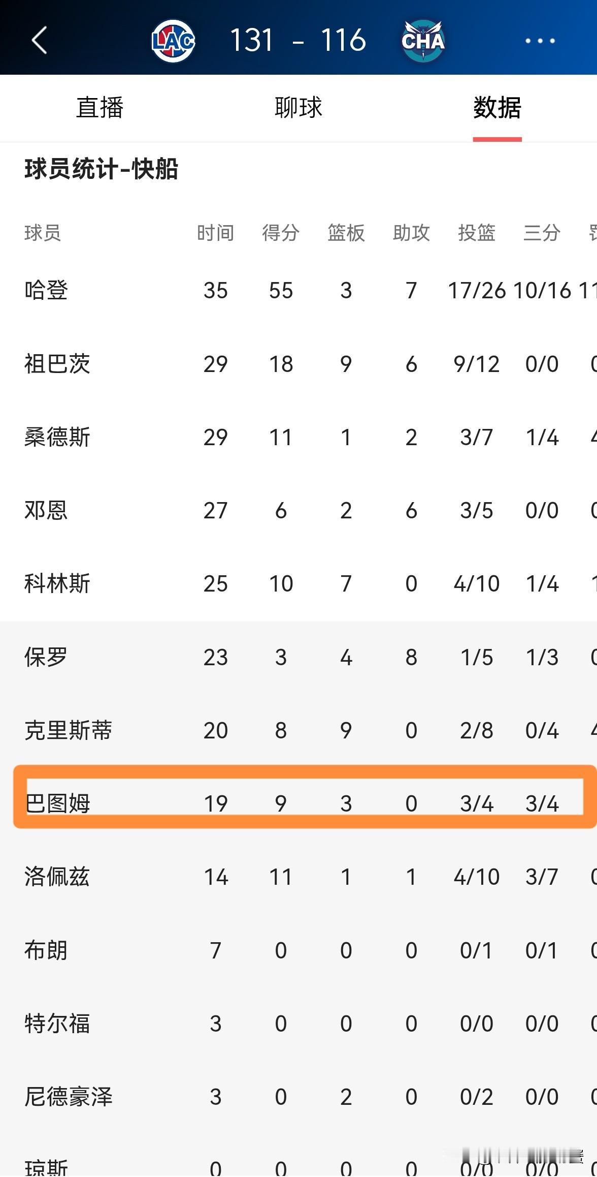 快船老将巴图姆真是太不懂事了!在今天快船客场以131:116击败黄蜂的比赛中,巴图姆面对旧主毫不手软,他用一记记无情的三分球刺痛了老东家的心。 整场比赛下来,巴图姆替补出战19分钟,三分球4中3得到9分3篮板2抢断,他的场上正负值为+18。 众所周知,巴图姆曾经在黄蜂得到了职业生涯最大的一份合同。