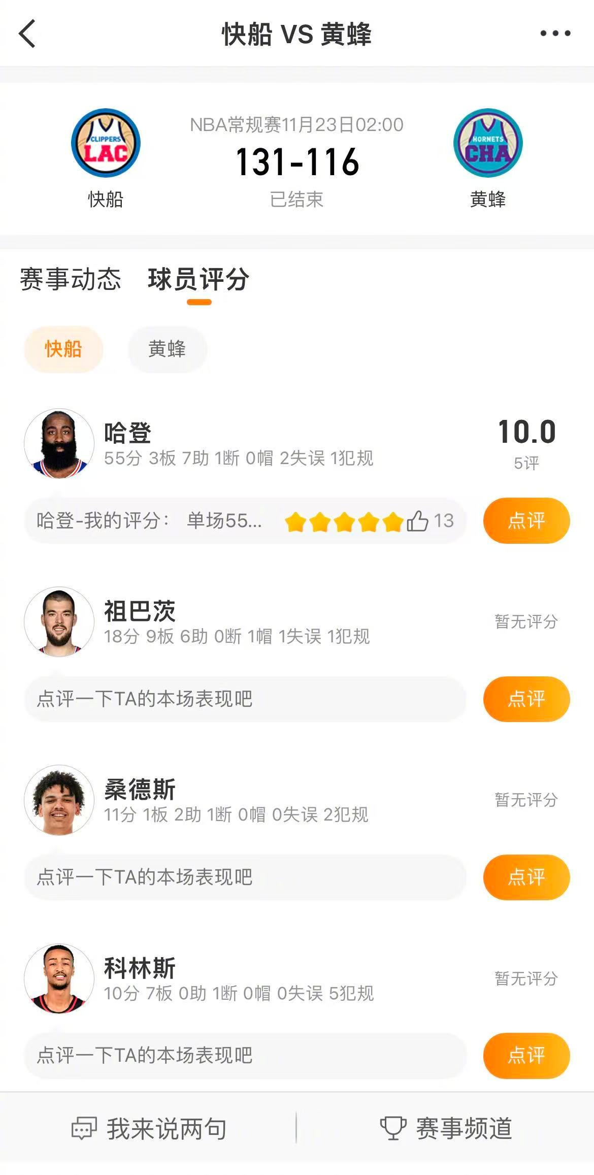 今夕是何年!快船131-116战胜黄蜂,结束三连败。哈登 爆砍55分3篮板7助攻1抢断,祖巴茨18分。黄蜂方面,克努佩尔26分,米勒21分。赶快进入 和 为球员表现打分吧!