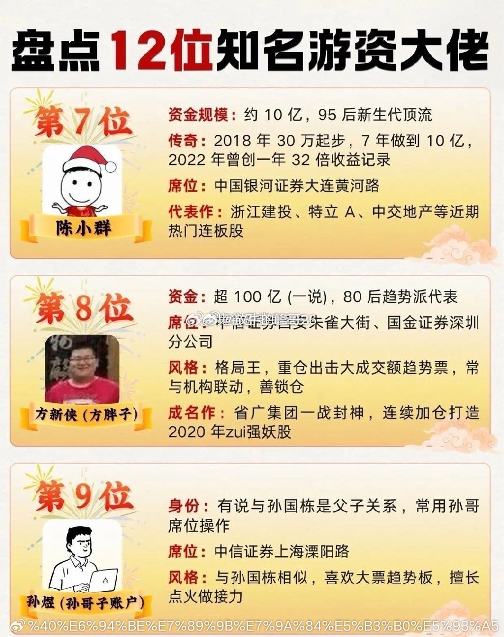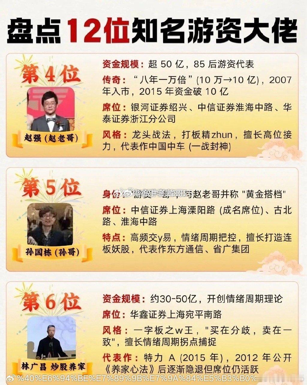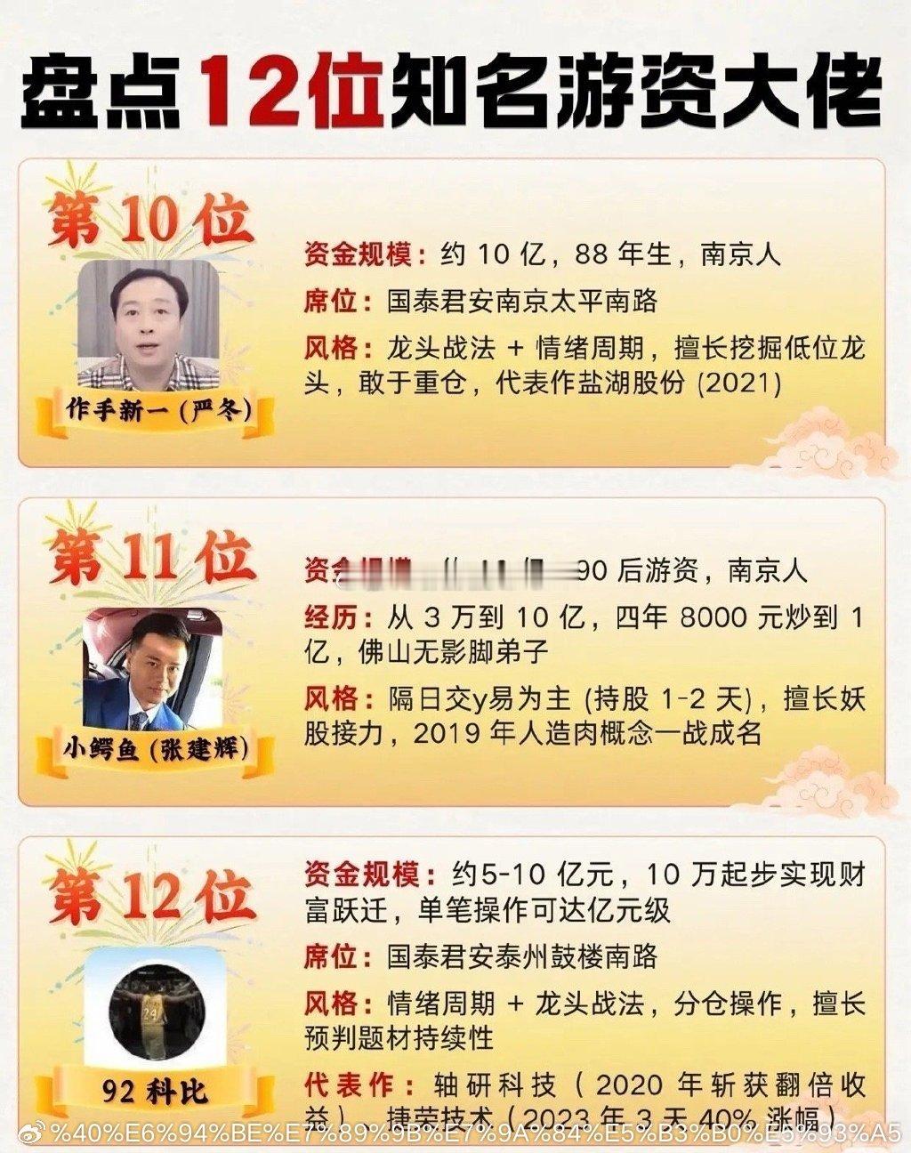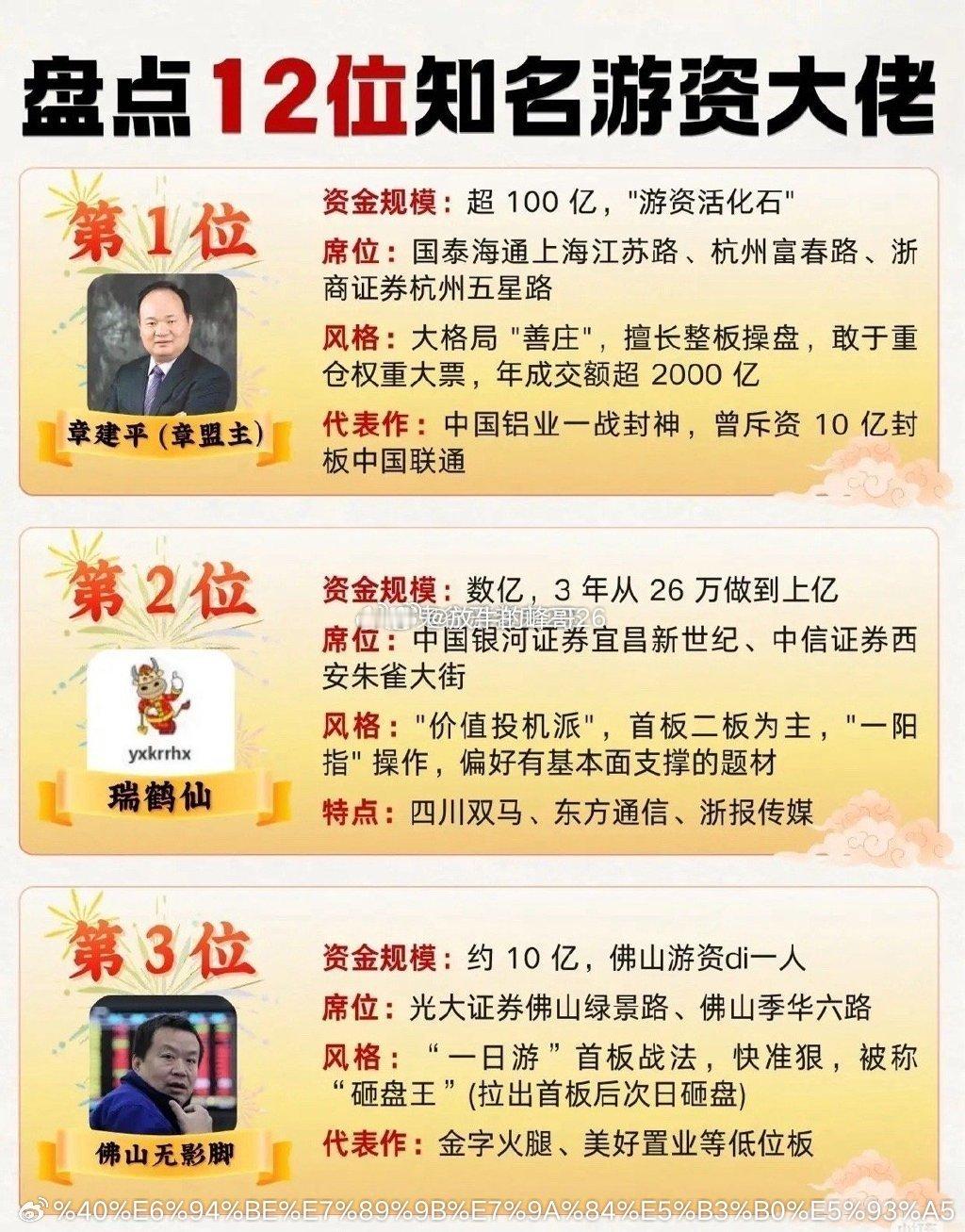 12位中国股市中极具代表性的知名游资大佬的核心信息,涵盖他们的资金规模、投资风格、代表席位、经典案例及个人特色,便于你快速了解每一位游资的特点:一、章建平(章盟主)——游资“活化石”- 排名:第1位- 资金规模:超100亿- 风格:大格局“善庄”,擅长整板操盘,敢重仓权重大票- 席位:国泰君安/海通证券上海江苏路、杭州富春路、浙商证券杭州五星路- 特点:被誉为股市中的“定海神针”,年成交额超2000亿- 代表作:中国铝业一战封神,曾斥资10亿封板中国联通二、瑞鹤仙- 排名:第2位- 资金规模:数亿(3年从26万做到上亿)- 风格:“价值投机派”,主打首板、二板,偏好有基本面支撑的题材- 席位:中国银河证券宜昌新世纪、中信证券西安朱雀大街- 特点:操作手法被称为“一阳指”- 代表案例:四川双马、东方通信、浙报传媒三、佛山无影脚- 排名:第3位- 资金规模:约10亿(佛山游资第一人)- 风格:“一日游”首板战法,快进快出,以“拉板+次日砸盘”闻名,被称“砸盘王”- 席位:光大证券佛山绿景路、佛山季华六路- 代表案例:金字火腿、美好置业等低位首板股四、赵老哥(赵强)- 排名:第4位- 资金规模:超50亿(85后游资代表)- 传奇经历:八年一万倍(10万→10亿,2007年入市,2015年破10亿)- 席位:银河证券绍兴、中信证券淮海中路、华泰证券浙江分公司- 风格:龙头战法,打板精准,擅长高位接力- 代表作:中国中车一战封神五、孙国栋(孙哥)- 排名:第5位- 身份:与赵老哥并称“黄金搭档”,有“游资一哥”之称- 席位:中信证券上海溧阳路(成名席位)、古北路、淮海中路- 风格:高频交易,善于把握情绪周期,擅长打造连板妖股- 代表案例:东方通信、省广集团六、炒股养家(林广昌)- 排名:第6位- 资金规模:约30-50亿- 贡献:开创“情绪周期理论”,著有《养家心法》- 席位:华鑫证券上海宛平南路- 风格:买在分歧,卖在一致,擅长捕捉情绪拐点- 代表作:特力A(2015年),《养家心法》2012年公开后仍影响深远七、陈小群- 排名:第7位- 资金规模:约10亿(95后新生代顶流)- 传奇:2018年以30万起步,2022年曾创一年32倍收益- 席位:中国银河证券大连黄河路- 风格:擅长热门连板股操作- 代表作:浙江建投、特力A、中交地产等八、方新侠(方胖子)- 排名:第8位- 资金规模:超100亿(一说)- 风格:格局大,重仓大成交额趋势票,常与机构联动,善锁仓- 席位:中信证券西安朱雀大街、国金证券深圳分公司- 代表作:省广集团(2020年最强妖股之一)附:孙煜(常被视作孙国栋的子账户或关联人)- 席位:中信证券上海溧阳路(孙哥席位)- 风格:点火做接力,偏爱大票趋势板九、孙煜(孙哥子账户)- 席位:中信证券上海溧阳路- 风格:与孙国栋类似,大票趋势+接力点火十、作手新一(严冬)- 排名:第10位- 资金规模:约10亿- 背景:88年生,南京人- 席位:国泰君安南京太平南路- 风格:龙头战法 + 情绪周期,擅长挖掘低位龙头,敢重仓- 代表作:盐湖股份(2021年)十一、小鳄鱼(张建辉)- 排名:第11位- 资金规模:约10亿- 背景:90后游资,南京人,从3万做到1亿(4年8000元→1亿)- 席位:未明确,但通常与南京资金圈有关- 风格:隔日交易为主(持股1-2天),擅长妖股接力- 代表作:2019年人造肉概念一战成名十二、92科比- 排名:第12位- 资金规模:约5-10亿(10万起步实现财富跃迁,单笔可操作亿元级)- 席位:国泰君安泰州鼓楼南路- 风格:情绪周期 + 龙头战法,分仓操作,擅长预判题材持续性- 代表作:轴研科技(2020年翻倍)、捷荣技术(2023年3天40%涨幅)总结亮点:- 资金王者:章建平(超100亿)、炒股养家(30-50亿)、赵老哥(超50亿)、方新侠(超100亿)、92科比(5-10亿)等均拥有巨额资金体量,操作影响市场。- 风格多元:有“善庄”章建平、“龙头战法大师”赵老哥和92科比、“情绪周期鼻祖”炒股养家、“一日游砸盘王”佛山无影脚、“85后传奇”赵老哥、“95后新秀”陈小群、“妖股之王”小鳄鱼等。- 代表理论:炒股养家的“情绪周期理论”、赵老哥的“龙头打板”、92科比的“预判题材持续性”等,对散户和游资圈影响深远。- 席位集中地:中信证券上海溧阳路、银河证券绍兴、华鑫证券上海宛平南路、国泰君安泰州鼓楼南路等,是游资活跃的重要交易通道。