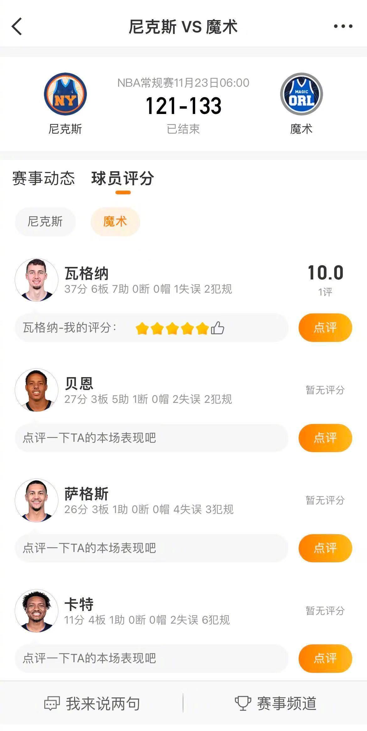 魔术133-121战胜尼克斯。瓦格纳37分6篮板7助攻,贝恩27分,萨格斯26分。尼克斯方面,布伦森 33分11助攻,唐斯 24分8篮板3助攻。进入 和 对球员表现进行打分吧!