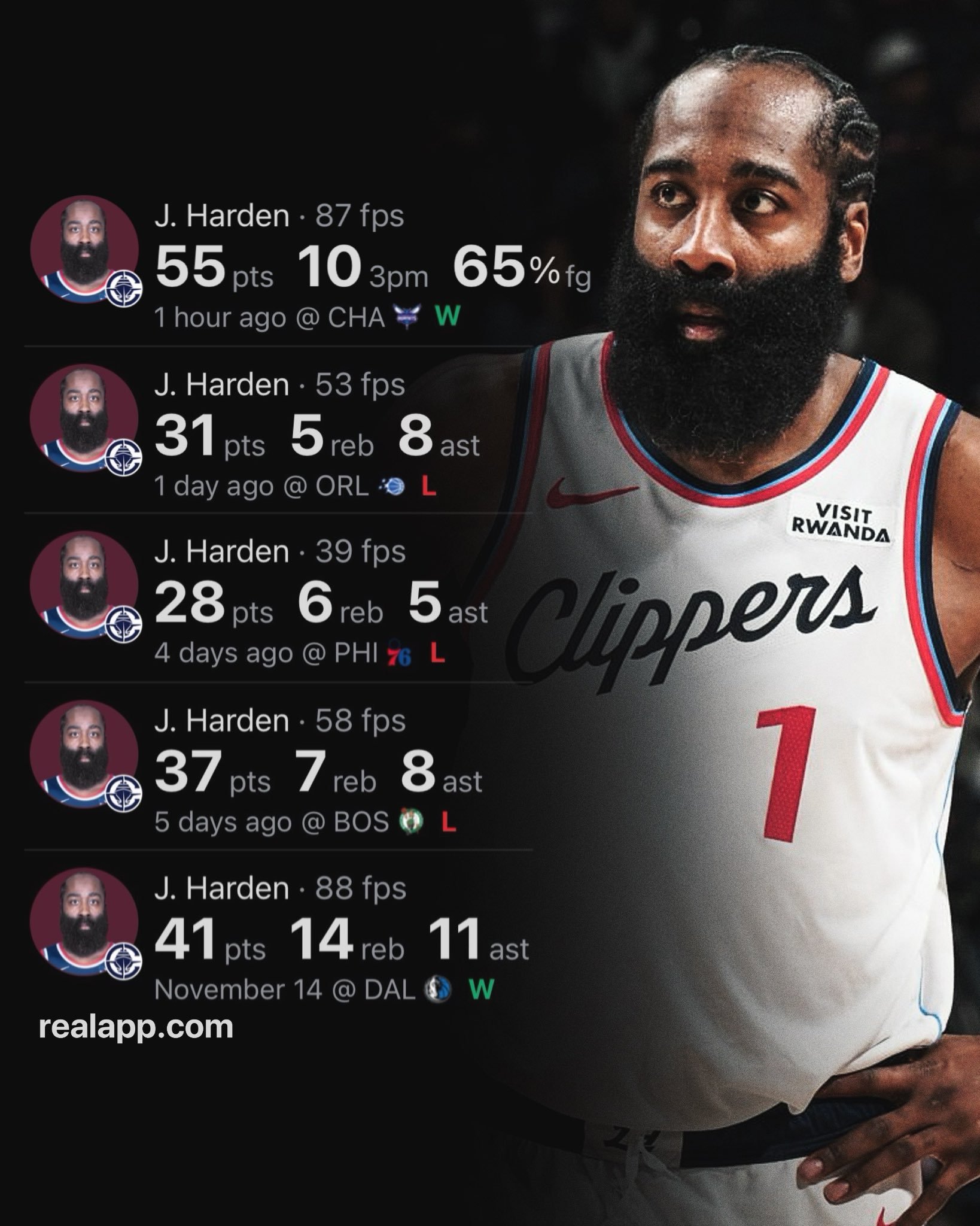 梦回巅峰!来看下过去5场哈登的表现!场均轰下38.4分7篮板7.8助攻,投篮命中率47.4%,三分命中率45.2%。