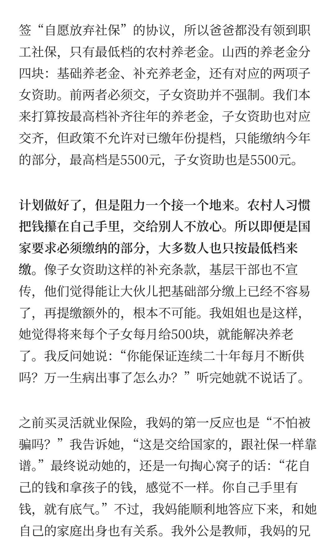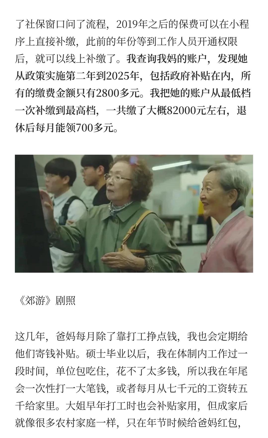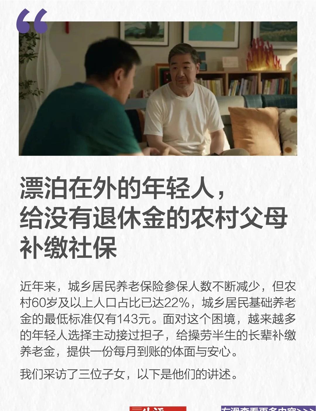给农村父母补缴社保的年轻人 近年来,城乡居民养老保险参保人数不断减少,但农村60岁及以上人口占比已达22%,城乡居民基础养老金的最低标准仅有143元。面对这个困境,越来越多的年轻人选择主动接过担子,给操劳半生的长辈补缴养老金,提供一份每月到账的体面与安心。我们采访了三位子女,以下是他们的讲述。 实习记者|余雯彤编辑|王海燕 城乡居民养老 养老 社保 退休金 农村 农民 年轻人 父母