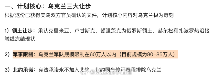 美国的麻烦有点多了先说一下市场吧,全球暴跌:硬是要找个理由的话就是美国那边失业率暴涨来到了4.4%,不仅大超预期(反向),而且还创下来了最近4年的最高值:这说明美国劳动力市场处于一个供大于求的状态,失业的人多了,但是就业的人少了。而且要知道这还只是9月份的情况,因为美国政府停摆,10月份的数据不发了,11月份的数据要在12月16号公布,但是美联储的议息会议是12月11号。那这就尴尬了。首先10月份的数据缺失了,11月份的数据公布又比较慢,如果这两个月失业率进一步飙涨呢?那这种情况下,12月份降息就应该降息。但问题是降息却意味着通胀的进一步上涨,通胀进一步上涨又会刺激失业率,失业率上涨美联储又得降息,降息之后通胀更加控制不住.....发现没有,这是一个死亡螺旋。未来美联储辗转腾挪的空间越来越小,而且这一次和1970年代还不一样,当时美国还是世界第一工业国,即使出现了大通胀还能扛得住。但是现在美国的体格已经没有那么好了,最终解决通胀的方式可能不在美联储,而是在其他的地方。今天来说说乌克兰的事情。就在刚刚,俄罗斯和美国私下起草和平方案,欧洲和乌克兰却没有上桌,直接被排除在外!那这份文件对美国、俄罗斯和欧洲的经济和局势有什么影响?俄罗斯和美国拿到了什么,欧洲和乌克兰又失去了什么?为什么又说这所谓的和平方案是一份割地方案?一个视频,就把这些问题说清楚。2025年11月21日,一份让整个欧洲和乌克兰政界震动的文件浮出水面。这份由美国起草的28点乌克兰和平计划,被美联社、路透社等多家外媒曝光。说是和平计划,不如说是一份充满争议的交易方案。这份方案不仅要求乌克兰割让大片领土,还要永久放弃加入北约的梦想,甚至把俄罗斯重新拉回G8!这不是我乱说啊,原文件写的就是G8。最让人吃惊的是这份计划的起草过程。据CNN披露,这是一份美俄两家关起门来商量出来的方案,乌克兰和欧洲几乎没什么发言权。而方案的核心内容堪称是俄罗斯的战利品清单。根据草案,克里米亚、卢甘斯克和顿涅茨克三个地区将被承认为俄罗斯领土。而赫尔松和扎波罗热按照接触线冻结,相当于事实上承认俄罗斯占领。乌克兰不仅要从顿涅茨克地区撤军,还得把这块地方变成非军事化缓冲区,但名义上属于俄罗斯。这还不算完!乌克兰军队规模要从现在的80多万削减到60万,永久写进宪法不能加入北约,北约也不能在乌克兰驻军。这等于彻底堵死了乌克兰向西方靠拢的道路。之前法国和英国还想向乌克兰派遣部队,也被这个计划直接否决了。扎波罗热核电站的安排也很有意思:这座被俄军占领了三年的核电站,将在国际原子能机构监督下重启,但发电量俄乌五五分成。想象一下,俄罗斯占领了你家的发电厂,然后说咱们一人一半电费……那作为交换,俄罗斯会得到什么?制裁分阶段解除,重返G8,和美国在人工智能、数据中心、北极稀土开采等领域建立长期经济合作。俄罗斯还将获得非侵略政策的法律保障,并与美国延长核不扩散和核武器控制条约,包括START I条约。从经济角度看,这份方案对美国自己倒是挺有利的。1000亿美元冻结的俄罗斯资产中,只有一半用于重建乌克兰,而美国要拿走其中50%的利润。剩下的钱投入到美俄联合投资基金,用来加强两国关系,防止再次发生冲突……方案第12条详细列出了乌克兰的重建计划,包括创建乌克兰发展基金投资科技、数据中心和人工智能等快速增长行业,美国将与乌克兰一起重建、开发和运营乌克兰的天然气基础设施。条款中明确写着,美国在提供安全保证后将获得经济上的补偿。美国既想当和平缔造者,又不想亏本,还要顺便和俄罗斯建立商业合作关系。方案第26条规定,所有参与冲突的各方都将获得全面赦免,不得追究战争期间的行为。这意味着俄乌官员和士兵不会因为战争罪行被起诉,这对那些在战争中失去亲人、家园的人们来说,无疑是晴天霹雳。我们再来看看各方反应。面对割地方案,乌克兰没有直接拒绝,而是说未来几天会和特朗普继续讨论。毕竟乌克兰现在的处境很尴尬,完全拒绝可能会惹怒特朗普,但接受这些条款又等于放弃了过去三年的奋战成果。但美国表示,战争必须结束,因为如果不结束,乌克兰可能会失去更多的领土。欧洲的反应就直接多了,据Politico报道,他们直接拒绝了美国的提案。欧盟表示任何和平谈判都必须有乌克兰和欧洲参与。卫报引述的评论更加犀利,称美国这份方案无异于欧洲的自我毁灭。欧洲担心,这份方案会给俄罗斯开绿灯,让俄罗斯相信只要打了就有回报。欧洲又会重新回想起被俄罗斯支配的恐惧。有意思的是,俄罗斯方面并没有公开表态支持这个方案。因为俄罗斯早就已经拿到了想要的东西,现在不急于表态,是为了保持谈判空间。但白宫的时间表却非常激进。美国希望俄罗斯和乌克兰在年底前达成协议。因为特朗普经公开说,这场冲突一个月内解决,结果却一直拖到了现在。但问题是,这场战争已经打了快四年,不是几周就能解决的。现在的局面就是,乌克兰和欧洲不能完全拒绝这个方案,因为得罪了美国后果严重。但他们也不可能照单全收,因为这等于放弃了所有坚持。Sky News就表示,欧洲和乌克兰无法冒着疏远美国的风险去完全拒绝这个方案,他们会拖延时间,希望能说服美国放弃俄罗斯的立场。其实这场战争打到现在,双方都精疲力