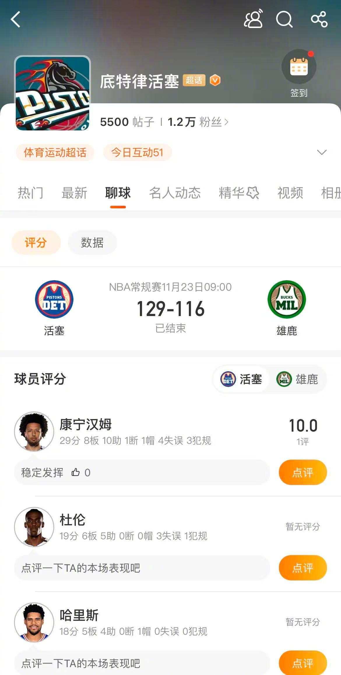 谁能阻止活塞?!活塞129-116战胜雄鹿,豪取12连胜!坎宁安29分8篮板10助攻,杜伦19分,哈里斯18分;雄鹿方面,罗林斯24分,波蒂斯18分。快进入球队超话 和 对球员表现进行打分吧!