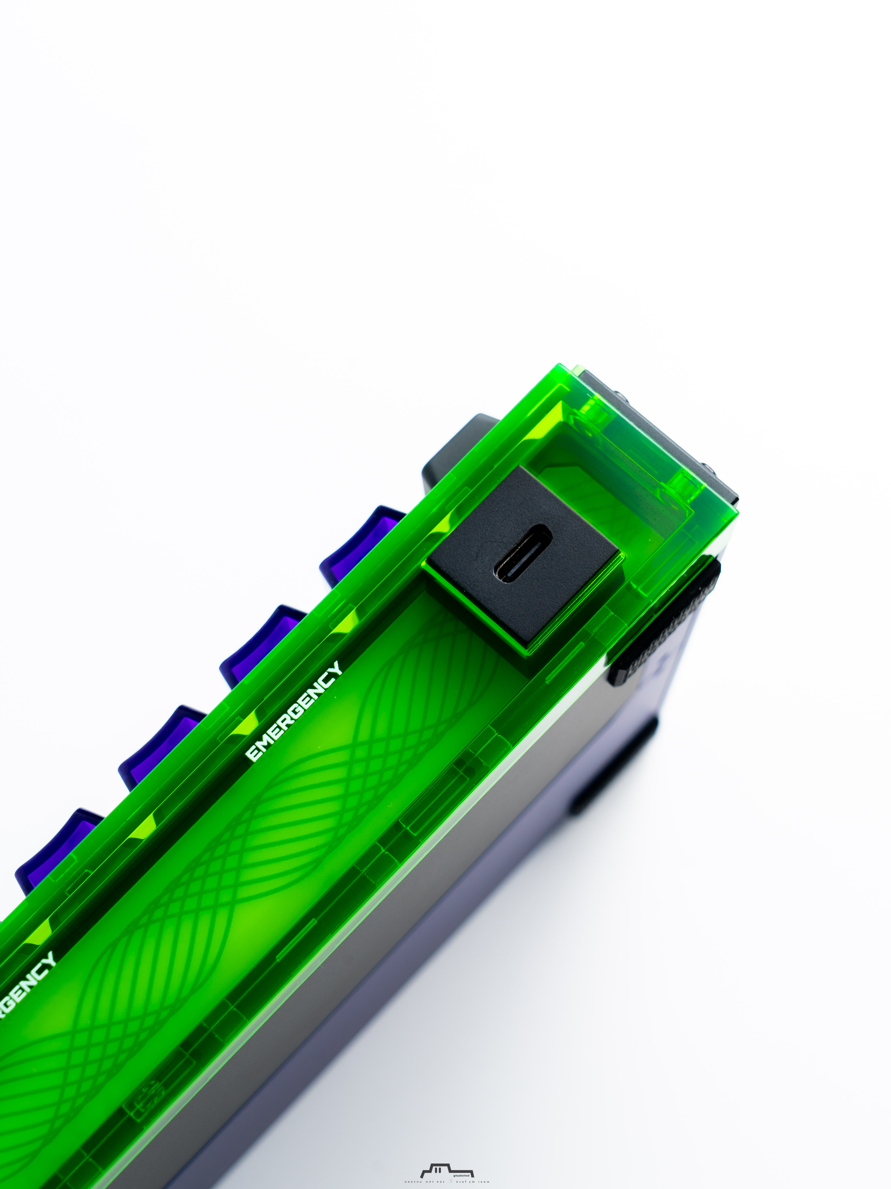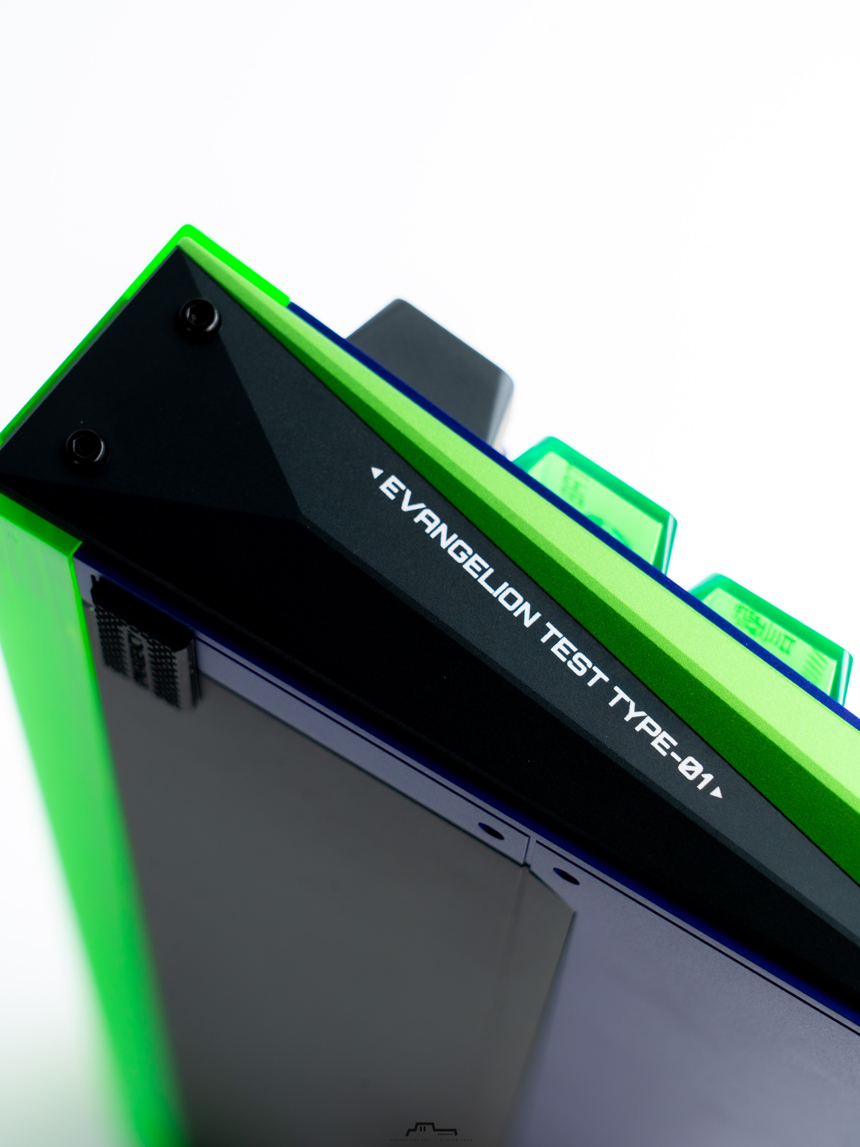 背板上面有激光雕刻的初号机图案 后面灯箱有绿色和紫色两款可选 默认的绿色,加上侧面的黑色组合 都算是致敬初号机「绿+黑」拘束扣设计