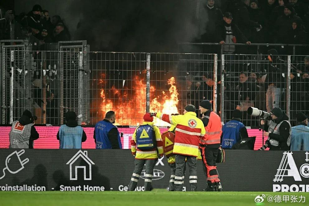科隆和法兰克福赛后,天空台还在采访法兰克福梅开二度的前锋布尔卡特,身后却是客队看台发生火灾的画面。消防人员快速出动,很快控制住火势。据说着火原因是获胜的法兰克福球迷,赛后开心点燃反对科隆俱乐部的横幅……
