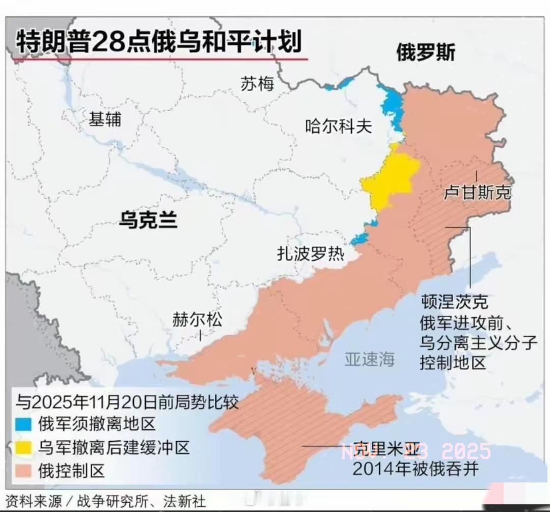 美国28点协议引爆争议:乌克兰要割20%领土?这盘棋藏着三重猫腻 2025年11月特朗普政府推动的俄乌冲突“28点和平计划”草案曝光,瞬间搅动全球地缘政治格局。最刺眼的条款直指领土划分:乌克兰需承认克里米亚、顿涅茨克、卢甘斯克归属俄罗斯赫尔松、扎波罗热按当前战线冻结现状,最终将失去约20%的国土——相当于15万平方公里比13个北京还大。这份被乌克兰民众怒斥为“投降协议”的方案背后藏着多方博弈的深层逻辑。 协议的领土条款堪称“精准切割”:乌克兰不仅要放弃已被俄方控制的区域,还得主动撤出顿涅茨克州仍在掌控的近5000平方公里土地,包括克拉马托尔斯克等关键城市,这些区域将被划为“俄罗斯领土内的非军事缓冲区”。作为交换俄方仅归还哈尔科夫州等零星地块,总面积不足乌方损失的0.5%,相当于用“三个新加坡大小”的领土,换走乌克兰五分之一的国土根基。更让乌方难以接受的是协议要求其在180天内正式承认这些领土变更,这直接违背了乌克兰宪法中“维护领土完整”的核心原则。 方案一经披露乌克兰国内炸开了锅。老兵怒斥“这是对牺牲战友的背叛”,反对党议员直言“等同于无条件投降”普通民众担忧“用领土换的和平只会是腐烂的和平”。泽连斯基政府陷入两难:一方面美方施压要求在“紧迫时间表”内推进谈判另一方面国内民意沸腾,接受协议可能引发政治危机[__LINK_ICON]。而俄罗斯虽未明确表态却对这份满足其核心诉求的方案表现出“谨慎欢迎”,实则坐收不战而胜的红利[__LINK_ICON]。 更值得玩味的是美国的“算盘”:协议规定俄罗斯被冻结的1000亿美元资产,将投入美国主导的乌克兰重建项目美方直接拿走50%利润;同时美俄将签署能源、稀土开采等长期合作协议,相当于用乌克兰的领土换美俄经济捆绑[__LINK_ICON]。欧洲则彻底被边缘化法、德、波等国纷纷抗议“和平不能是投降”,要求参与谈判却遭美方忽视,跨大西洋盟友裂痕凸显[__LINK_ICON]。 这场打着“和平”旗号的谈判本质上是大国主导下的利益分配。乌克兰沦为博弈棋子,20%领土的背后是无数家庭的流离失所,是浴血奋战换来的主权尊严被轻易践踏。目前泽连斯基已明确划出“不割地、要北约安全保障、不赦免战争罪”三条红线,但美方是否让步、俄方能否妥协、欧洲如何破局都让这场谈判充满变数。 你怎么看待这份“28点计划”?