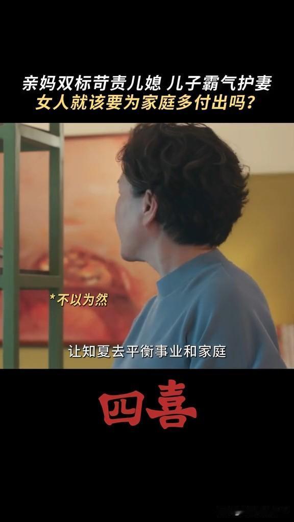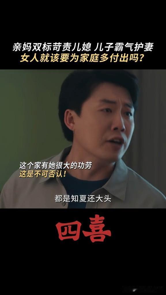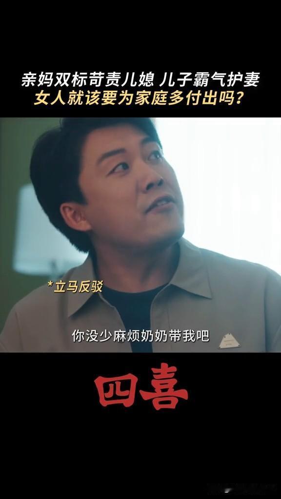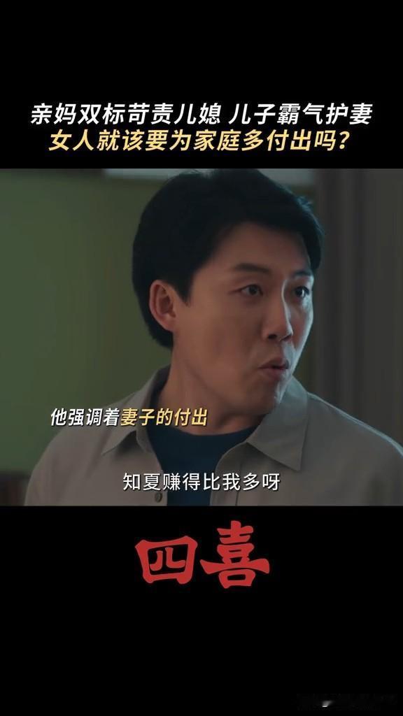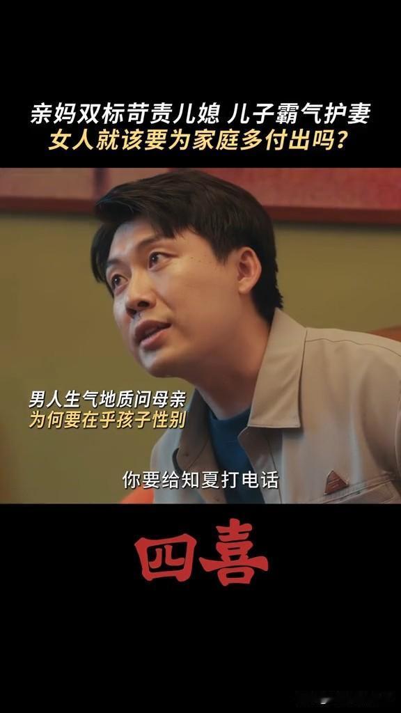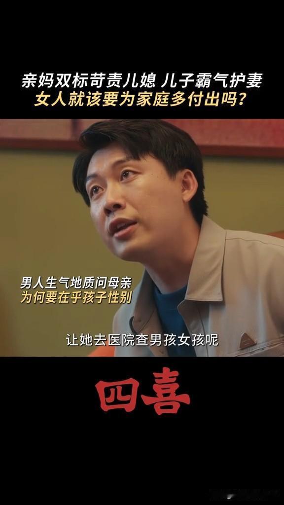 《四喜》婆婆要求知夏查肚子里的是男孩女孩,结果被自己亲儿子怼 这个婆婆重男轻女,知夏怀孕,非要她去查男女,男孩就打算买学区房,女孩就算了 结果张浩怼他妈妈,你当妈妈的时候没少让奶奶带我,现在当奶奶了,高标准严要求要求知夏平衡事业与家庭,你怎么不要求我呀! 张浩虽然不求上进,但是他还是爱知夏的