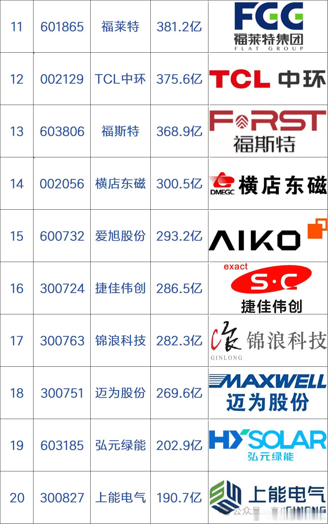 中国光伏设备上市公司市值TOP20名排行榜