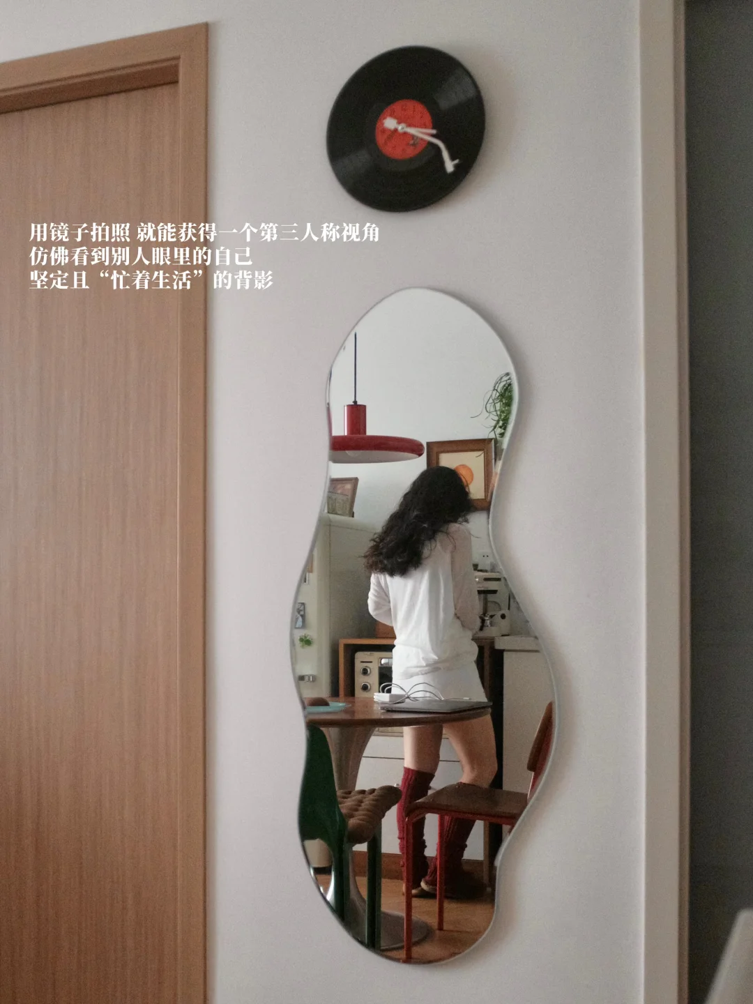 《镜中沉思》午后的阳光透过百叶窗的缝隙,在米色地板上织出一片菱形光网。她半蹲在