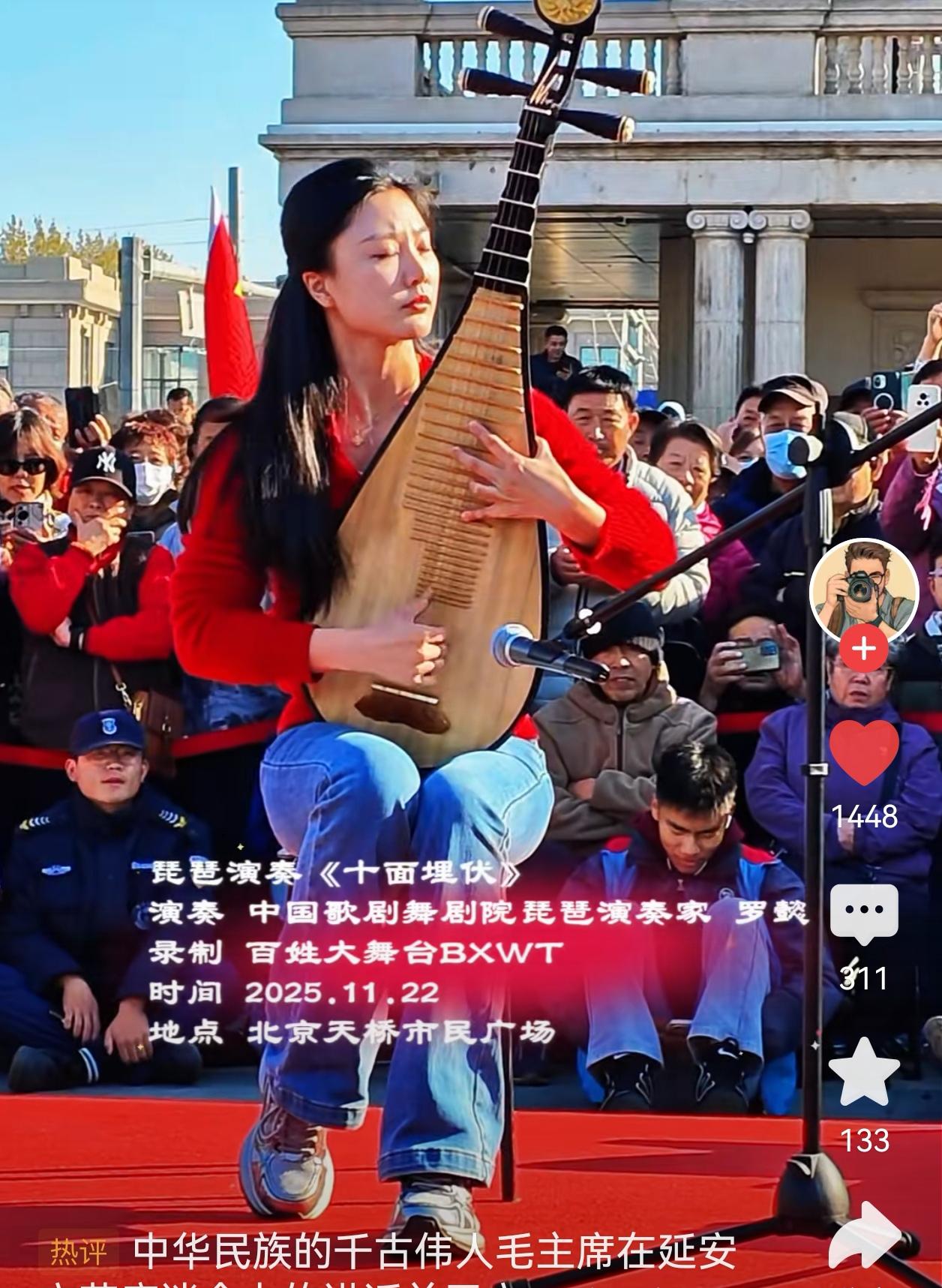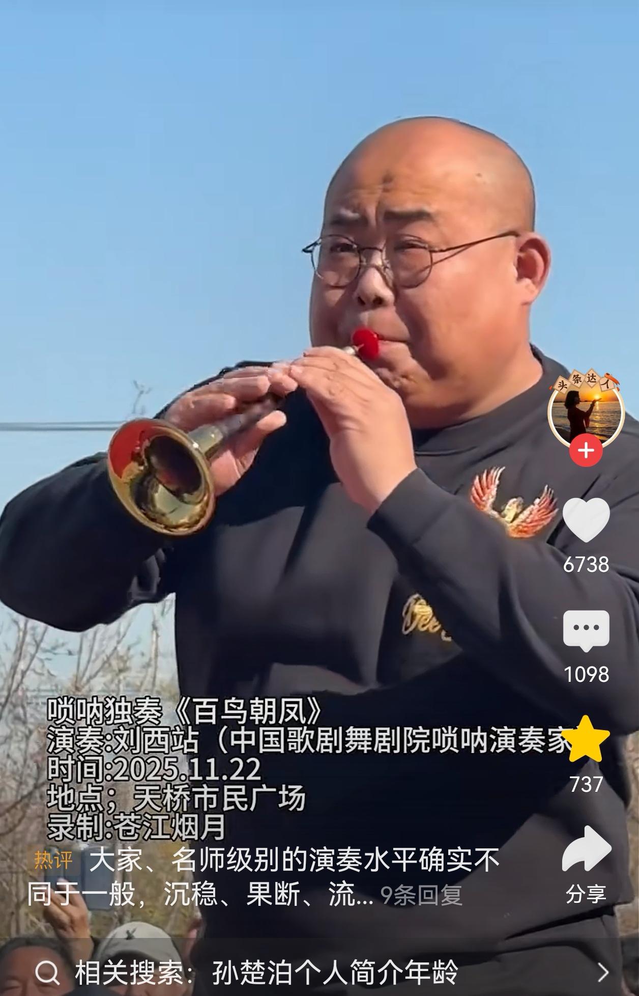 在北京生活有什么好?周末在街头就可以观赏国字头大师的器乐表演! 22日,北京天气和暖,天桥市民广场人头攒动、热闹非凡。中国歌剧舞剧院的孙楚泊老师的表演从紫竹院公园搬到了天桥广场。更令人惊喜的是孙老师还邀请了她剧院的两位同事青年琵琶演奏家罗懿、唢呐大师刘西站。孙楚泊老师的笛子大家很熟悉,不多说了。罗懿演奏了一曲《十面埋伏》,非常精彩。刘西站吹奏了一曲《百鸟朝凤》技惊四座,不仅好听,居然还能和现场观众互动,这就是大师水准! 北京像中国歌剧舞剧院这种国字头演出团体还有很多,在孙楚泊老师的带动下应该还会有更多艺术家走上北京街头献艺(当然也能为他们赚取流量),让北京人民能在街头巷尾享受更多高水准的文艺演出。 这也是北京这座文化名城的魅力之一吧。所以你说为啥要定居在北京?因为她确实有自己独特的魅力。 我爱北京!