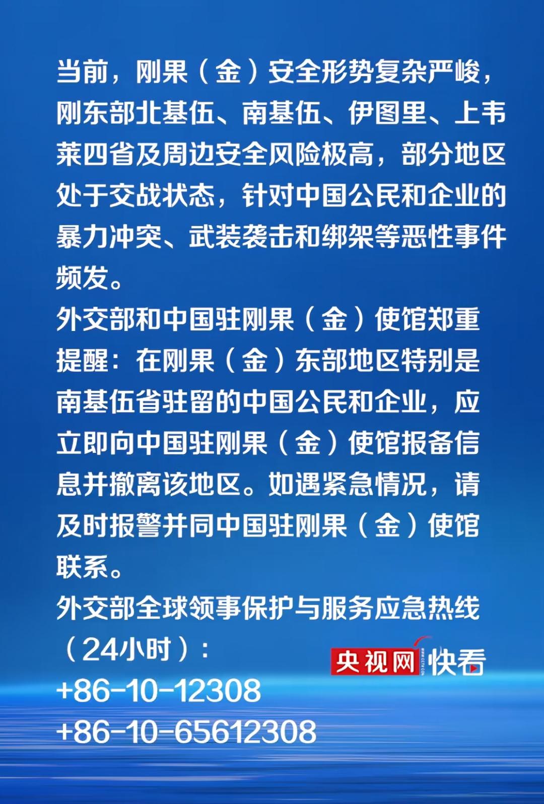 中国紧急提醒,驻留在刚果(金)东部地区的中国公民应立即撤离! 这个地方本身就已经形势非常的危急了,这一次直接说立即撤离看来是再也待不住了,世界上只要有人的地方,就有中国同胞的身影。 有很多同胞为了多挣一点钱,前往了一些不发达国家做生意,有的是在那里开设各种店铺,有的是做相关的配套,有的是在当地采矿。确实面临的风险和机遇是在国内所不能比拟的,也祝愿广大同胞们能够安全。 各位是怎么看的?欢迎评论区留言。