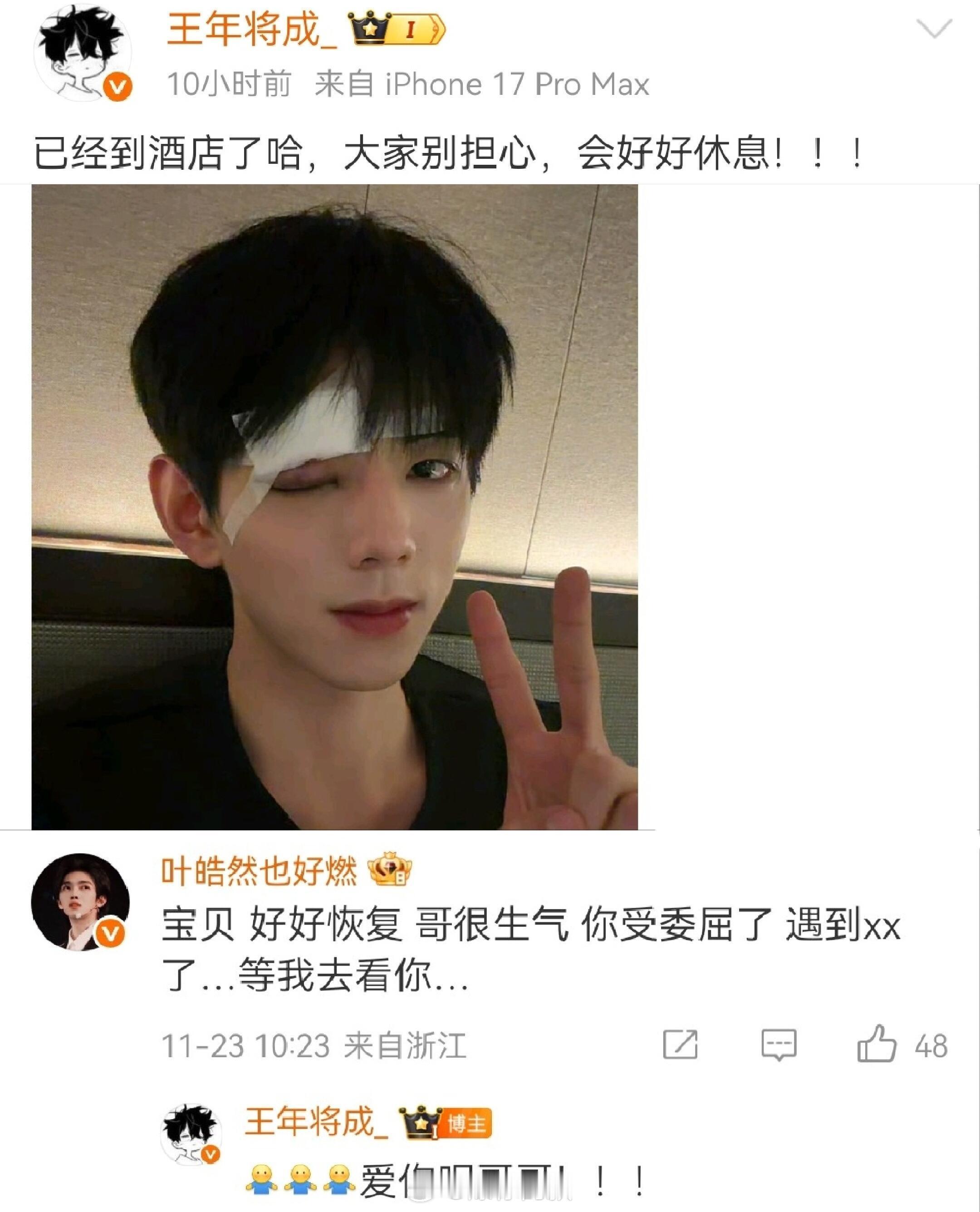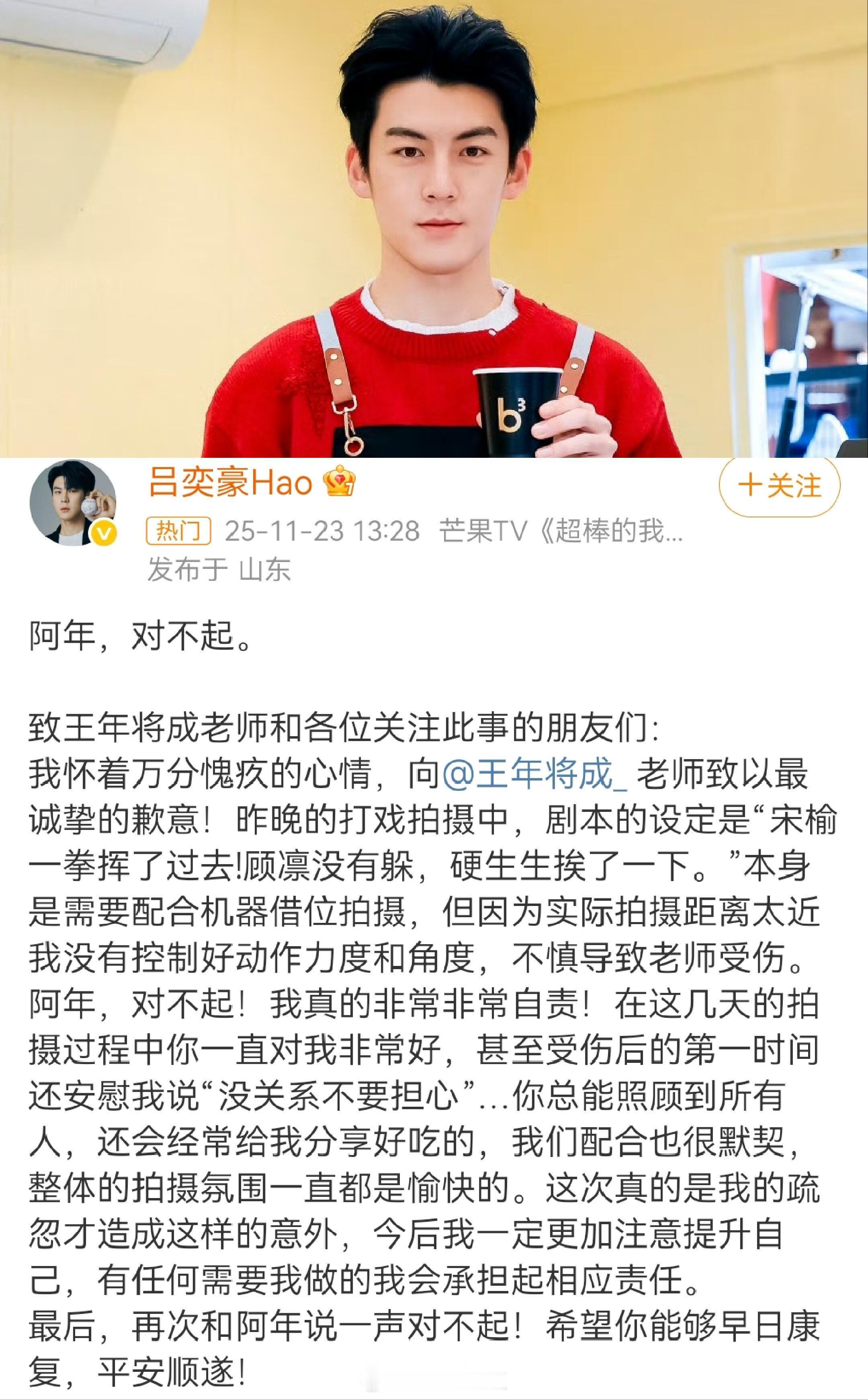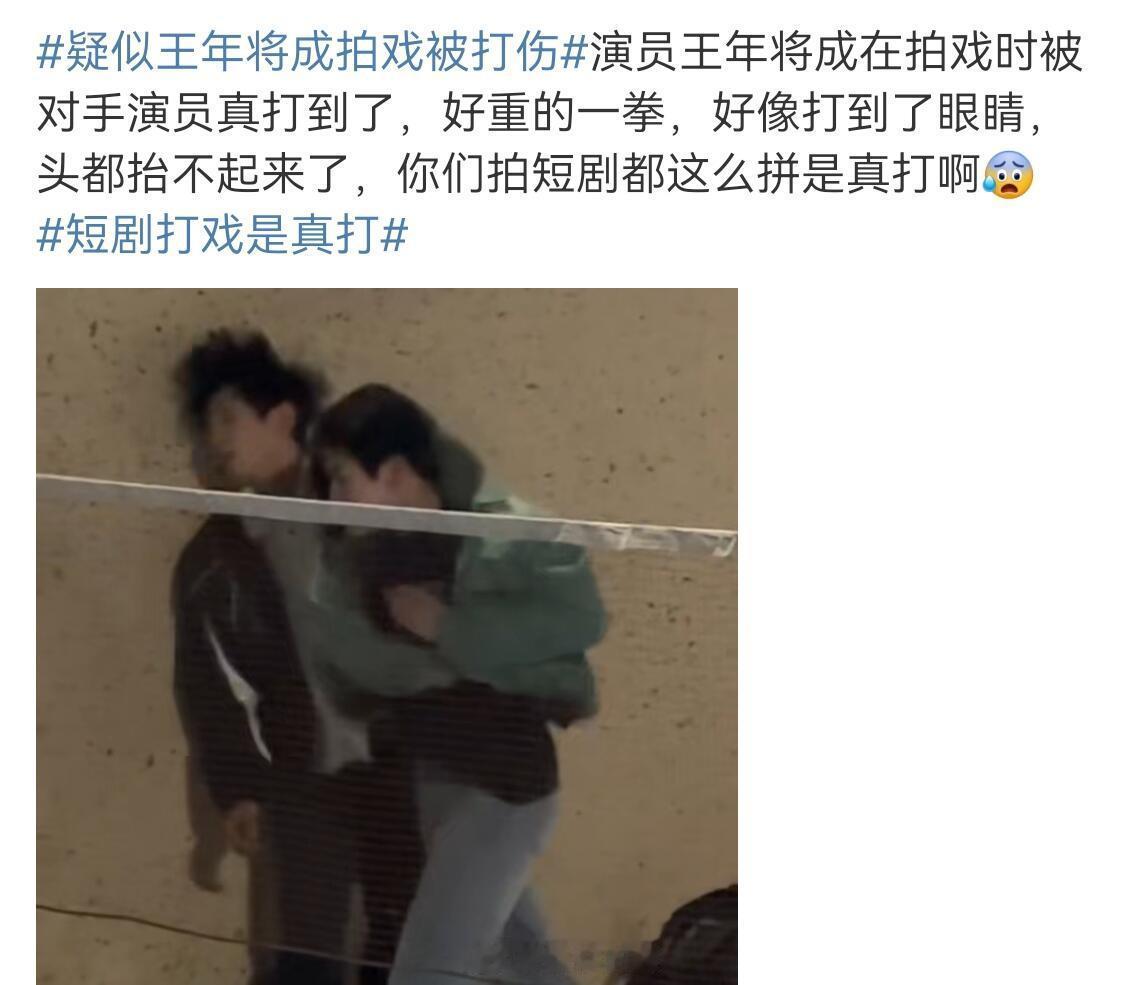 拍戏打伤王年将成的短剧演员吕奕豪发文道歉此前,王年将成在拍摄《芝芝不倦》时被男二号吕奕豪打伤了,叶皓然还来安慰王年将成,视频看确实下手重了,挺严重的,希望小王年早日康复!