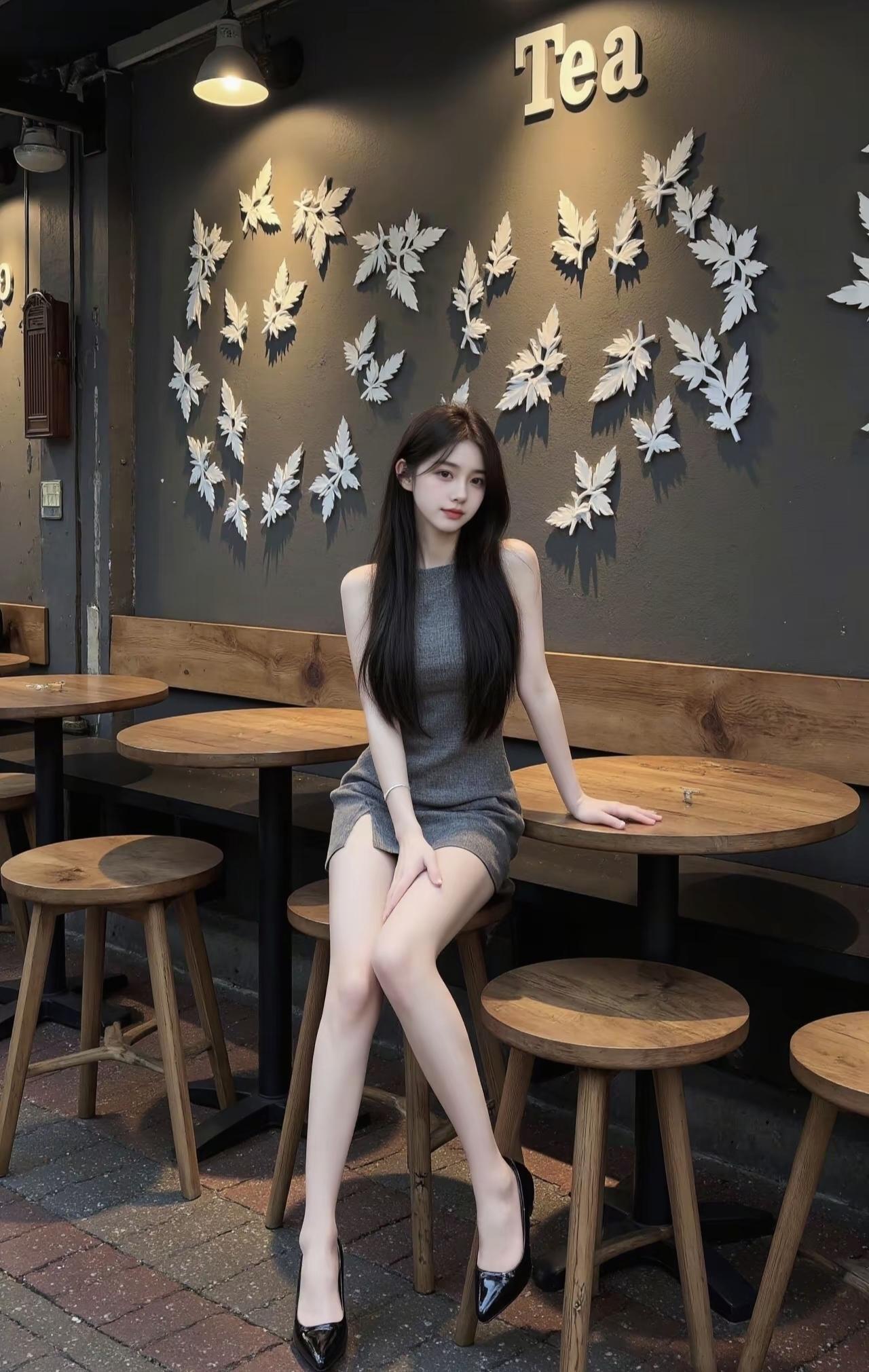 暖灯把木桌的纹理浸得温软,墙面上的叶影是静下来的风。灰裙裹着松弛的弧度,长发垂落时,连空气都浸了点茶味的慵懒。