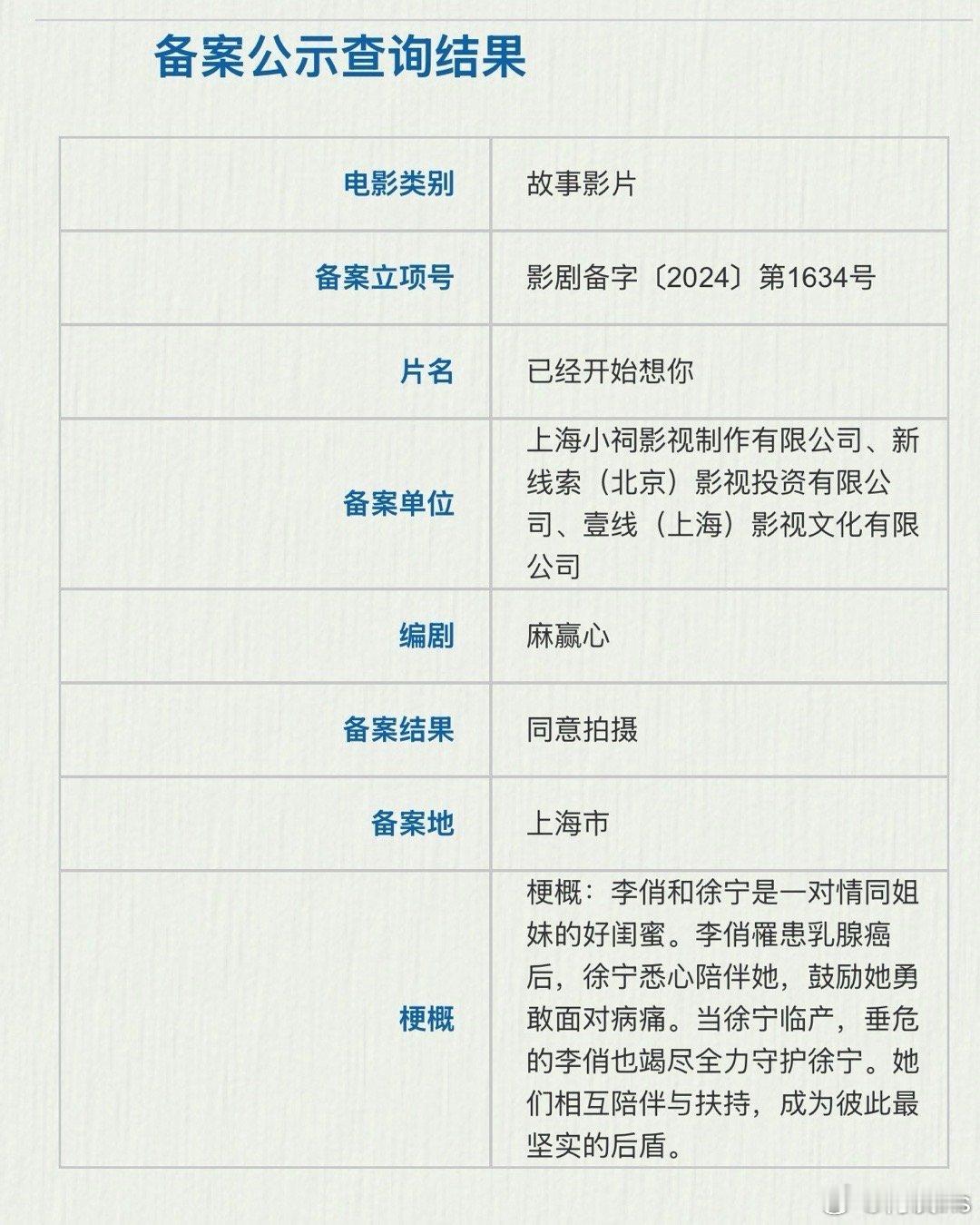 电影《我的女朋友》(《已经开始想你》)开机主演:章若楠、金靖导演:麻嬴心《鹦鹉杀》梗概:李俏和徐宁是一对情同姐妹的好闺蜜。李俏罹患乳腺癌后,徐宁悉心陪伴她,鼓励她勇敢面对病痛。当徐宁临产,垂危的李俏也竭尽全力守护徐宁。她们相互陪伴与扶持,成为彼此最坚实的后盾