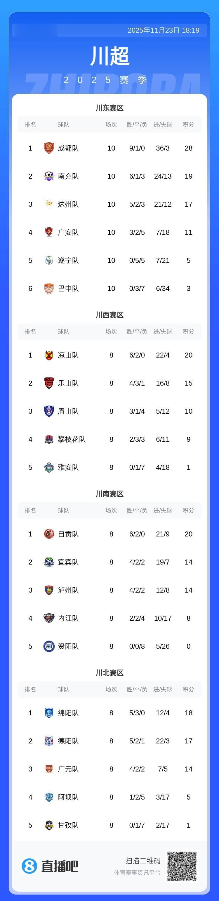 直播吧11月23日讯川超联赛第一阶段分区赛结束,4个赛区共有9支球队晋级总决赛。