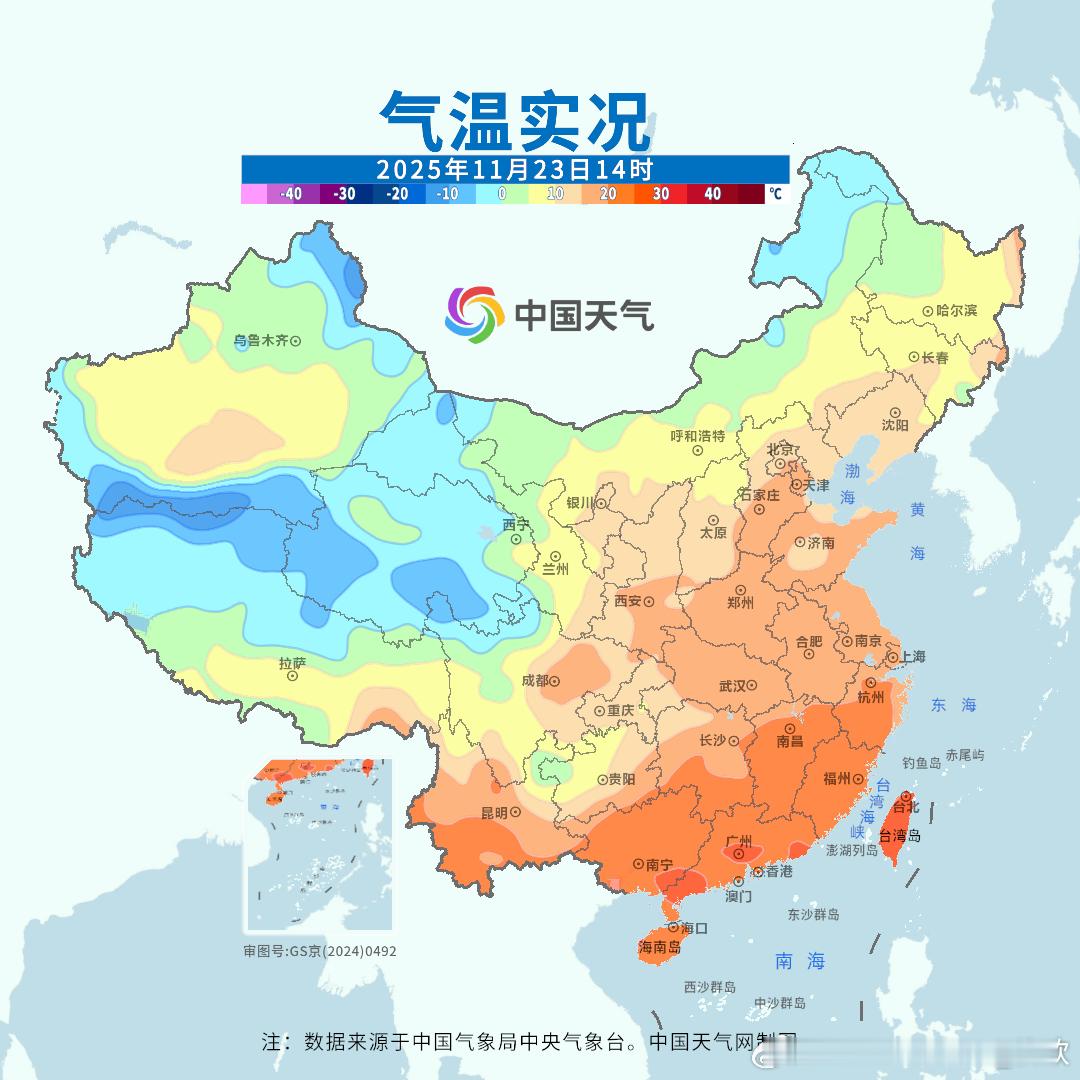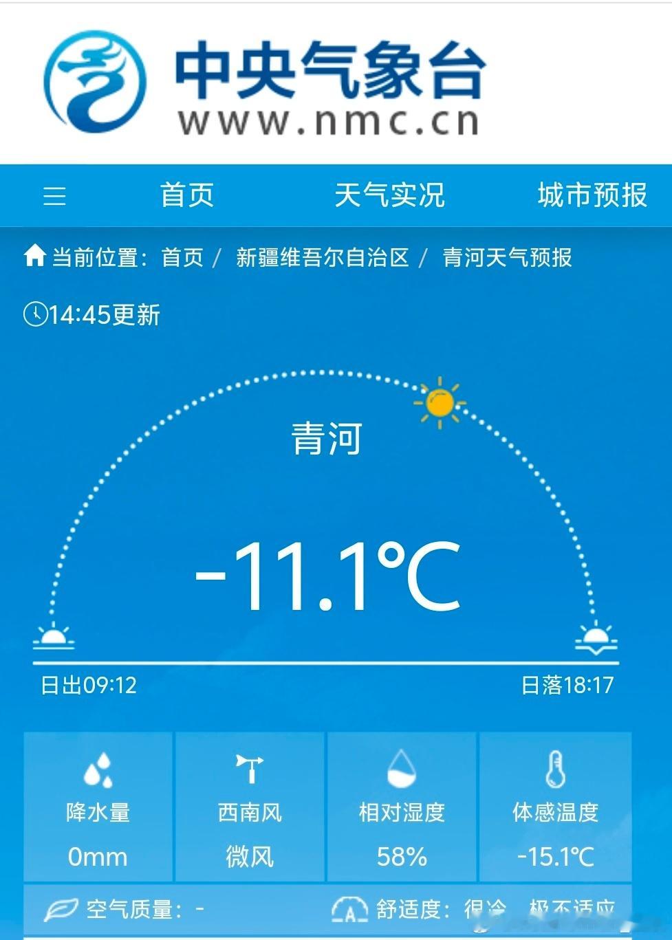 【气温】今天因为冷空气影响,新疆北部和甘肃西部、内蒙古西部出现4-12℃降温。新疆东北部的青河下午气温低于零下10℃,与同时次的海南东方,温差39℃。