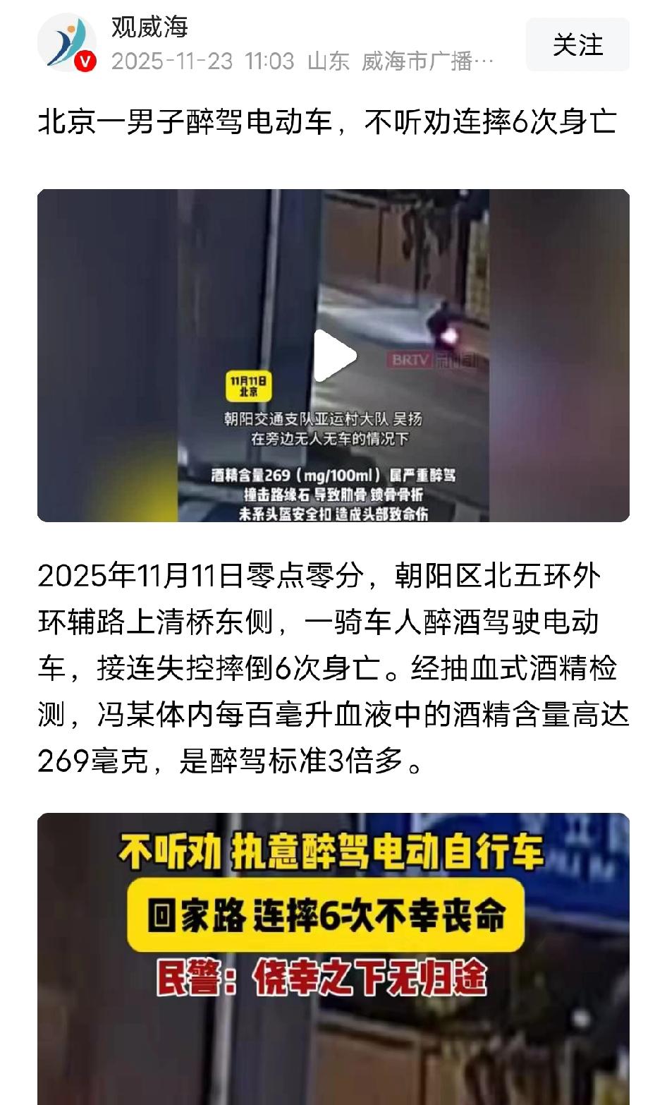 2025年11月11日零点,在北京朝阳区北五环外环辅路上清桥东侧发生一起事故,引人注意。 骑车人冯某醉酒驾驶电动车,连续失控摔倒6次后身亡。经检查冯某血液酒精含量269mg/100ml,是醉驾标准(80mg/100ml)的3倍多。 醉酒导致失控,冯某未系头盔安全扣造成头部致命伤。 这个事件也提醒了酒驾(包括电动车辆)的极高危险性,以及正确佩戴安全装备的重要性。 网友们得知此事,议论纷纷,有网友说:“这酒非喝不可么?!小饮怡情,大饮伤身,过饮殒命,再好的酒也要量力而行!” 还有网友说:“我们喝酒后都是给别人偷偷送到家,因为看他喝多了说送他不让送,安全最重要。” 也有网友说:“ 成年人就该为自己行为负责,怎么一出事,这也怪,那也赔,酒厂的酒,便利店,超市的酒,餐馆的酒和提供场地,这些是不是也得连带责任。” 出门在外千万不能喝酒,喝了酒也不可以自己回家。一定要让家人来接,或者是让没有喝酒的朋友送回家。 在和朋友吃饭时,大家不要劝酒 。喝点饮料就可以,不要喝酒 。生命安全放在第一位 。