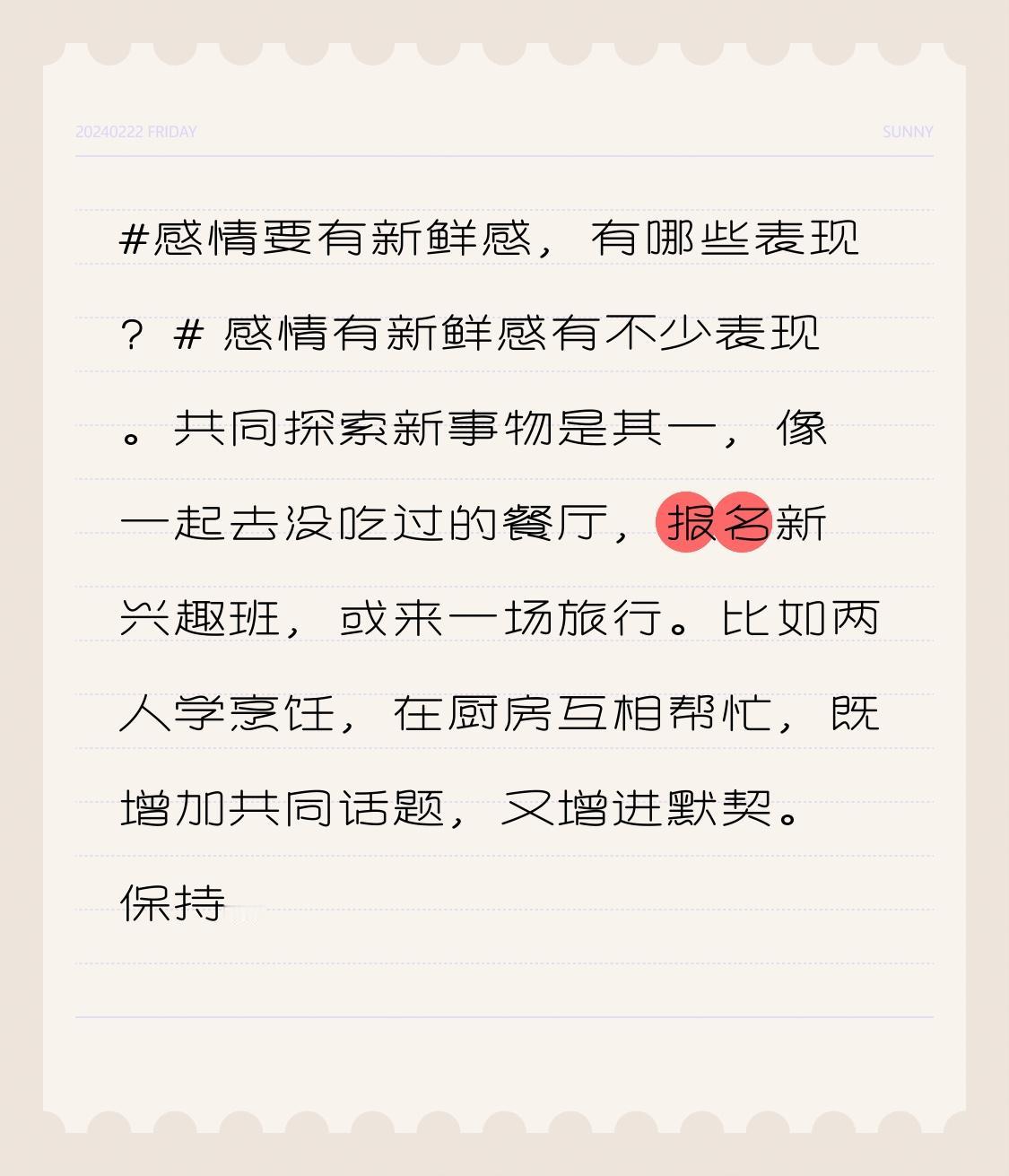 感情有新鲜感有不少表现。共同探索新事物是其一,像一起去没吃过的餐厅,报名新兴趣班