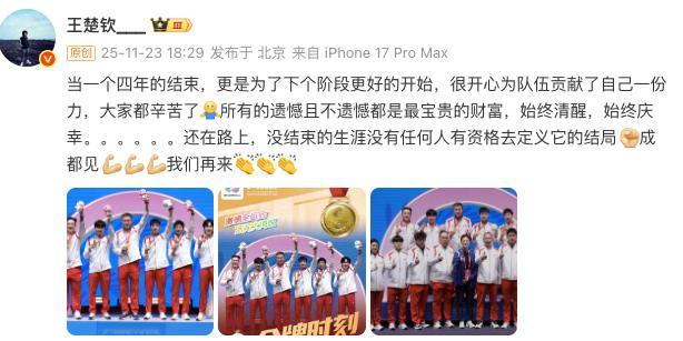 第十五届,王楚钦收获男团金牌和男单铜牌,下一站,成都混合团体世界杯。 发文:当一个四年的结束,更是为了下个阶段更好的开始,很开心为队伍贡献了自己一份力,大家都辛苦了。所有的遗憾且不遗憾都是最宝贵的财富,始终清醒,始终庆幸,还在路上,没结束的生涯没有任何人有资格去定义它的结局,成都见,我们再来!