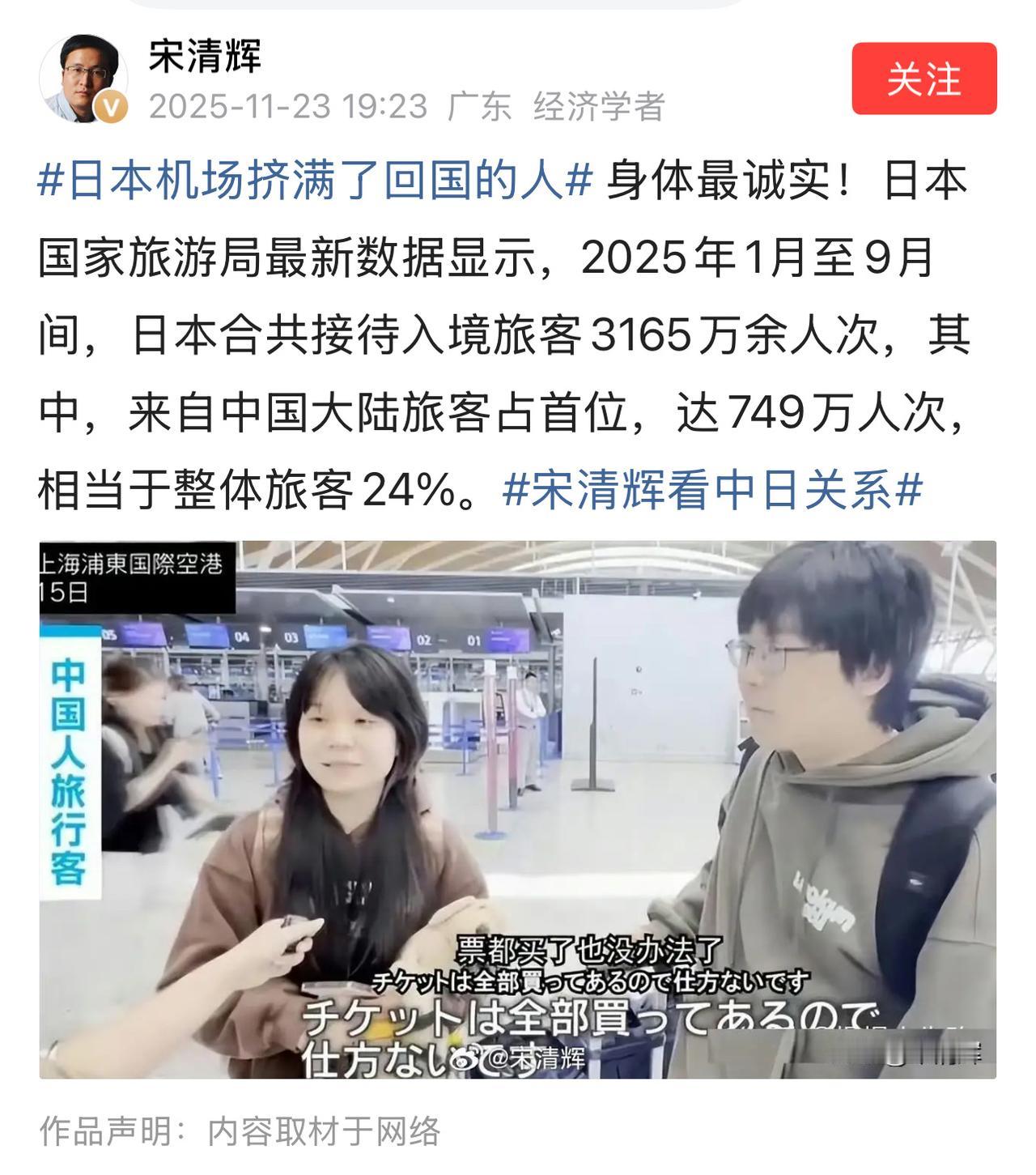 宋清辉:身体最诚实! 日本国家旅游局最新数据表明,2025年,1-9月,日本累计接待入境旅客3165万余人次。 其中,来自中国大陆的旅客数量居首,达749万人次,占整体旅客的24%。