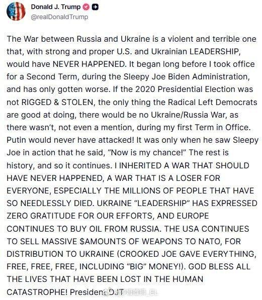 在日内瓦谈判进行的过程中,特朗普再次发帖谈论俄乌冲突,先批评泽连斯基说谢谢说少了,然后批评拜登未能阻止战争,最后骂欧洲国家还在买俄罗斯石油。