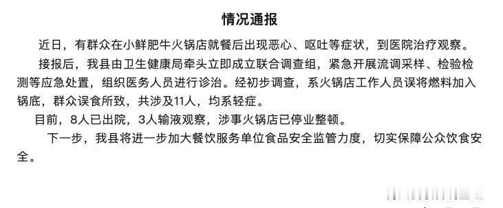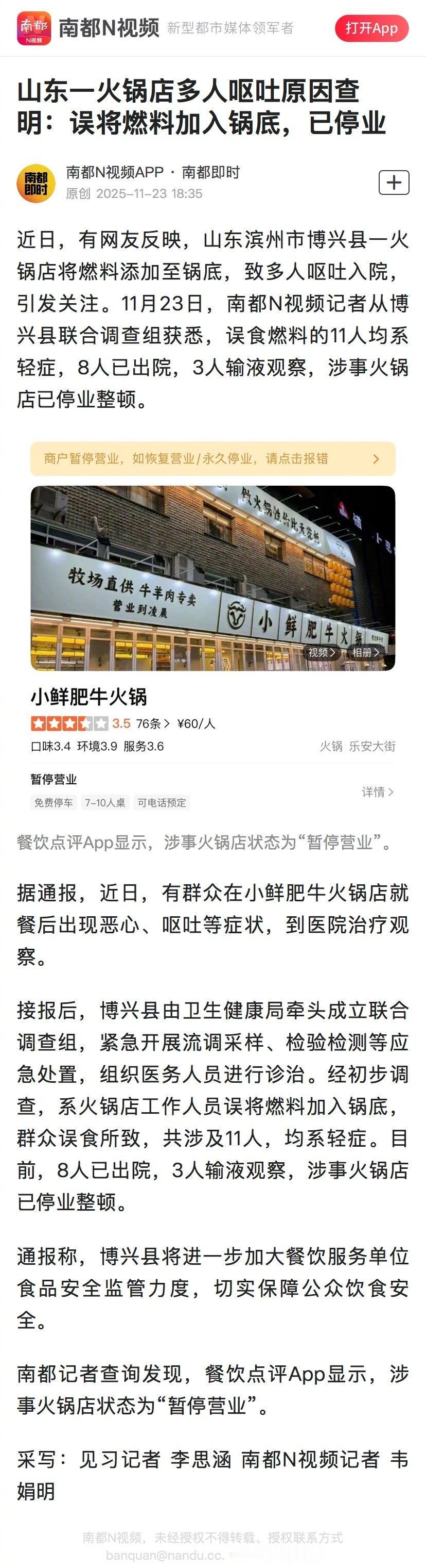 【官方通报火锅店误将燃料加入锅底致11人入院 】11月23日,山东滨州市博兴县联