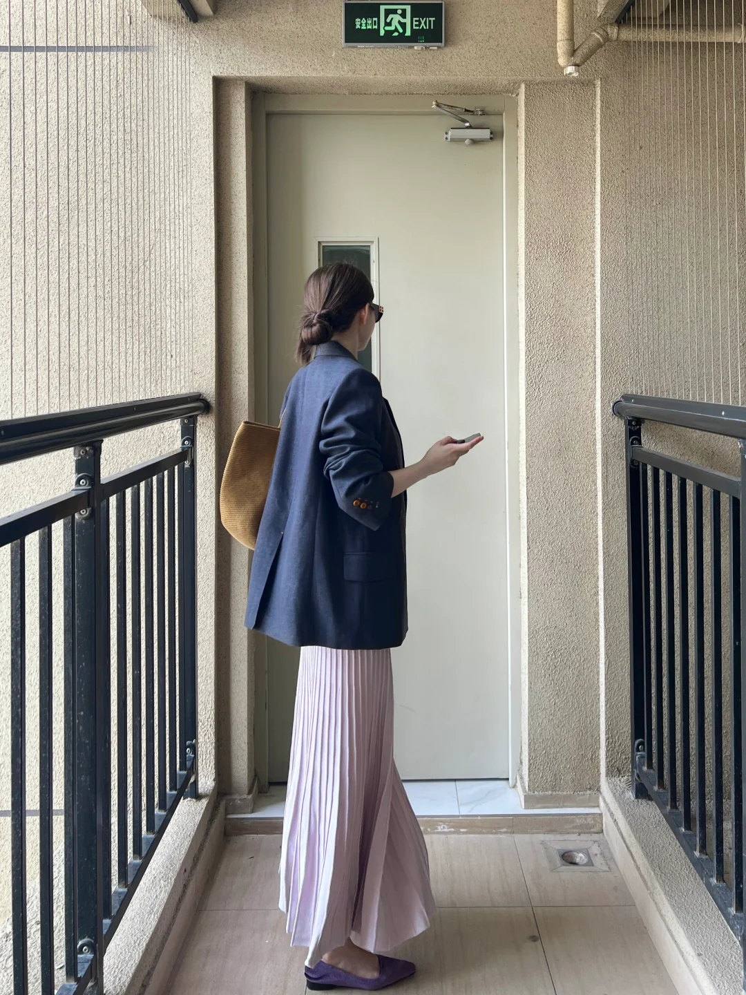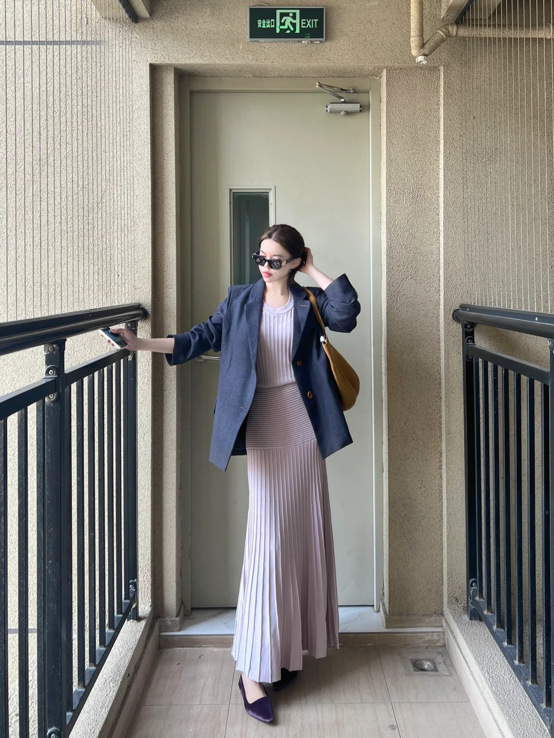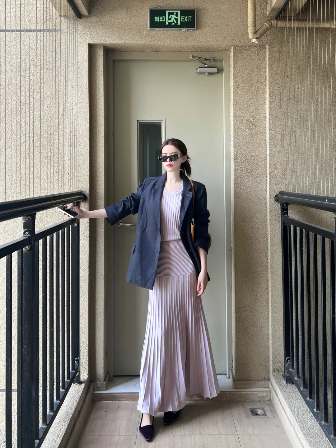 是灰色西装➕淡紫色针织套装裙