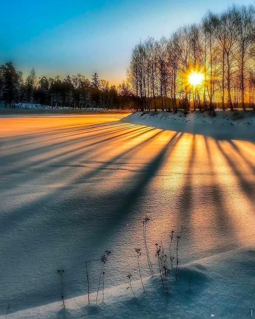 这是冬日里被阳光吻过的冰河吧~雪裹着冻土,落日把树影拉成金色的丝,连枯草都沾了暖光的甜。