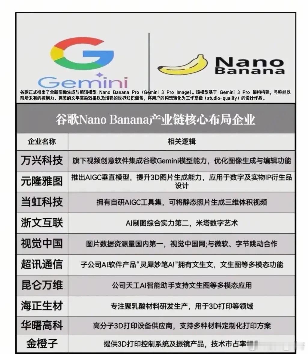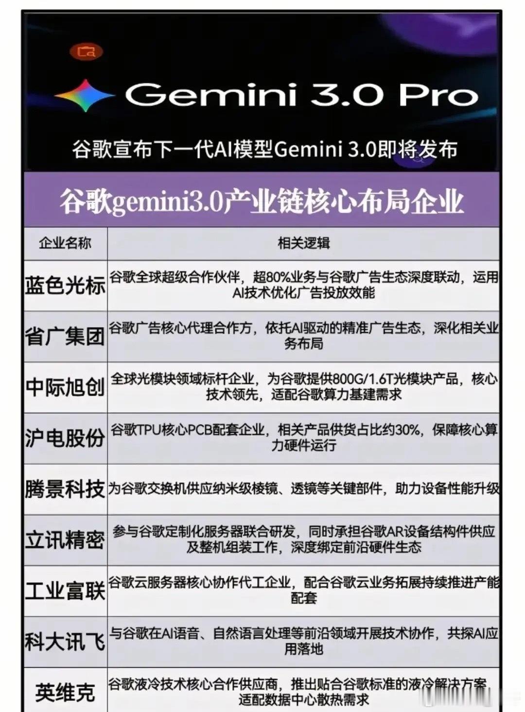 谷歌AI大模型概念龙头梳理!谷歌美股股价一度上涨5.8%,美股人气榜排名第三!近日谷歌发布新款大模型Gemini 3,该模型在性能上全面刷新多项行业纪录。同步推出配套开发平台并快速落地全生态,还引发行业和市场的强烈反响。中国上市公司与谷歌关联度较高的公司有哪些?蓝色光标:公司连续多年跻身全球传播集团前十,是谷歌全球超级合作伙伴,超80%业务联动广告生态。省广集团:中国广告行业的领先企业之一,是谷歌广告核心代理。光迅科技:光模块、光器件行业龙头,是谷歌OCS主要供应商。万兴科技:集成Gemini模型优化图像生成。