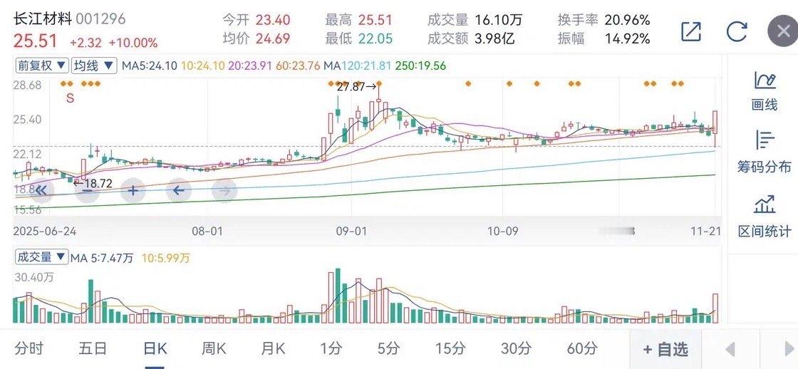 连板巨量阴:长江材料倍量涨停要冲锋!上周五长江材料低开低走,午后震荡站稳分时均线,迅速涨停!后市如何?简单分析一下:1.左峰四板巨量阴,调整2月,凹间峰,可以看做是主力试攻!2.突然涨停,振幅14%,涨停板带着长尾巴,主力开始拉升。3.看周线图,长腿倍量阳盖阴,看涨形态。看周月线图,均线和MACD共振,趋势向上,上涨形态。