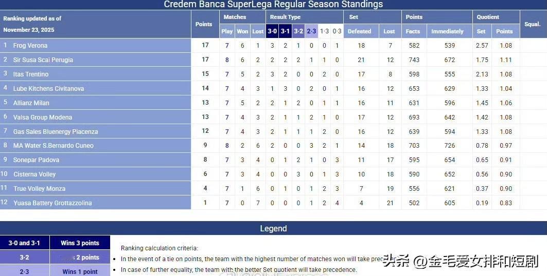 【意超男排最新积分榜】 11月23日,意超男排第七轮战罢。维罗纳6胜1负17分重回榜首,多赛一场的佩鲁贾6胜2负17分排名次席,特伦蒂诺和奇维塔诺瓦暂列三四位,格罗塔佐利纳一胜难求继续垫底。
