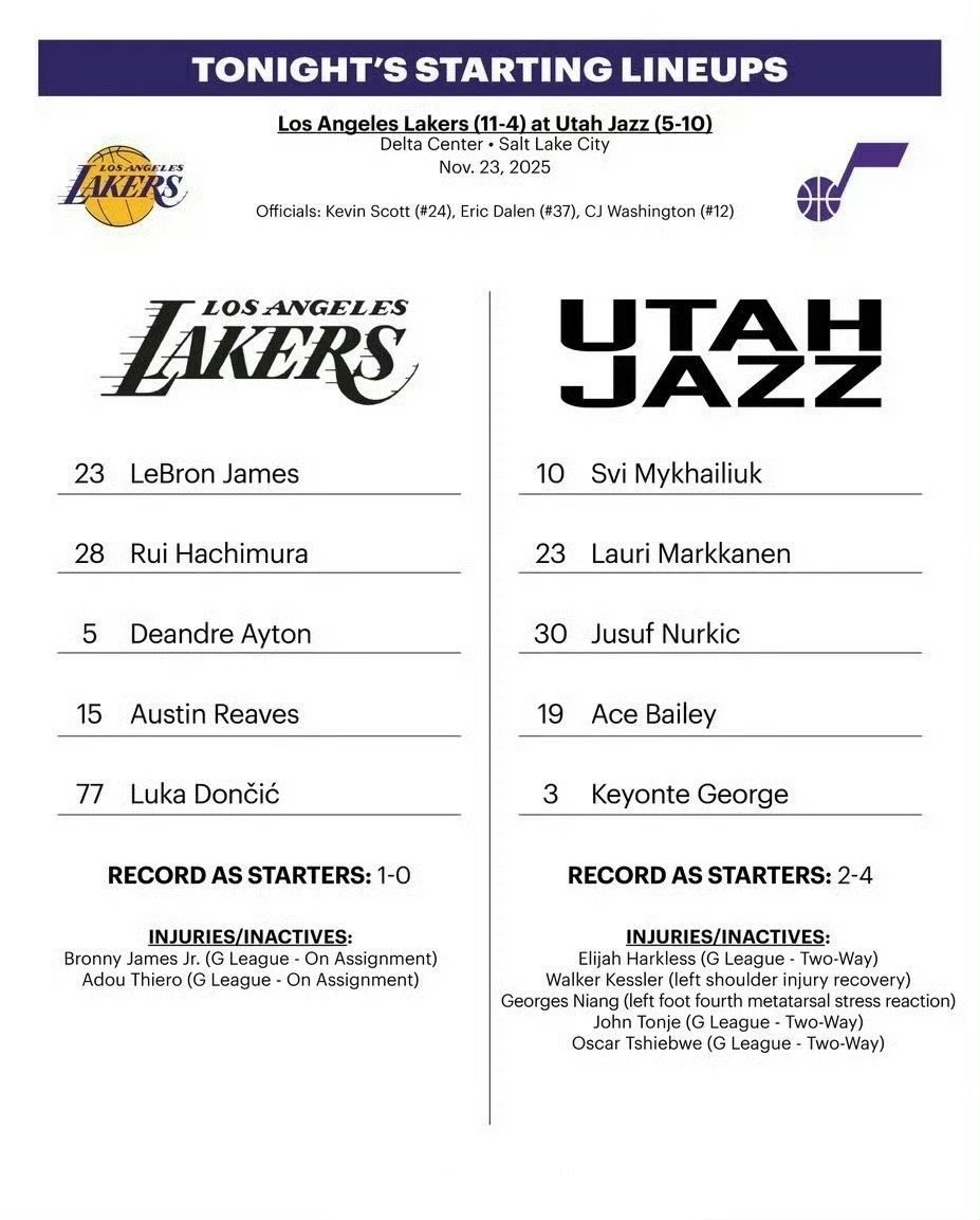 今日首发: 东契奇,里夫斯,八村塁,詹姆斯,艾顿!