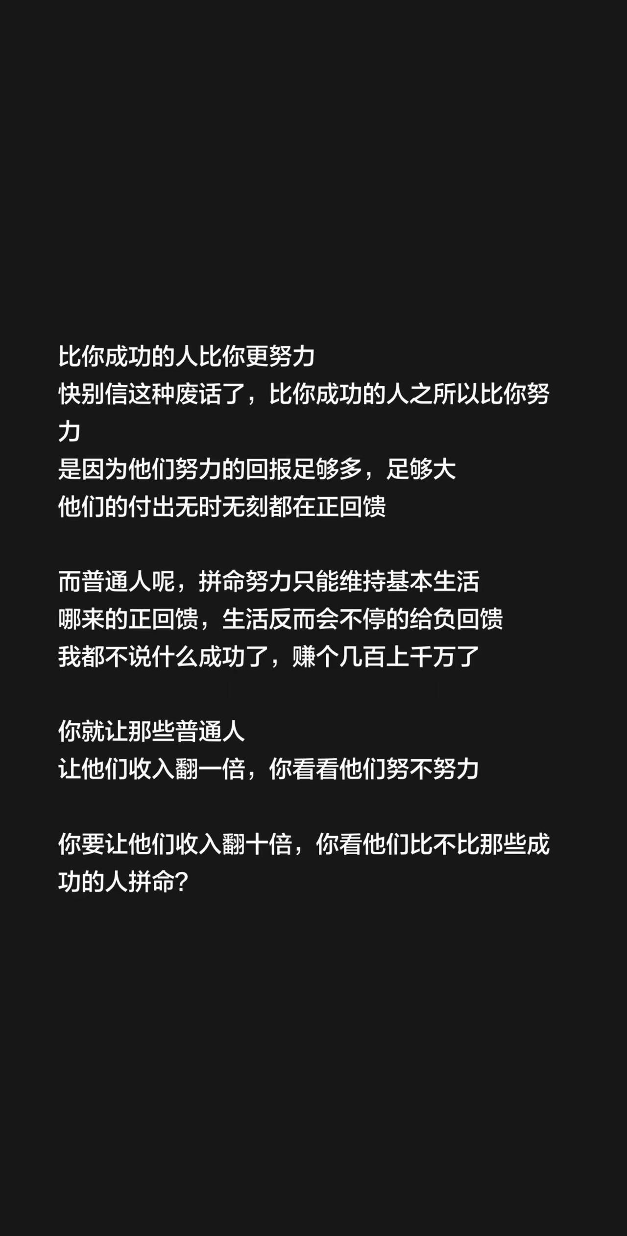 比你成功的人比你更努力快别信这种废话了,比你成功的人之所以比你努力是因为他们努力的回报足够多,足够大他们的付出无时无刻都在正回馈而普通人呢,拼命努力只能维持基本生活哪来的正回馈,生活反而会不停的给负回馈我都不说什么成功了,赚个几百上千万了你就让那些普通人让他们收入翻一倍,你看看他们努不努力你要让他们收入翻十倍,你看他们比不比那些成功的人拼命?