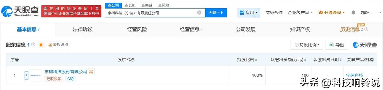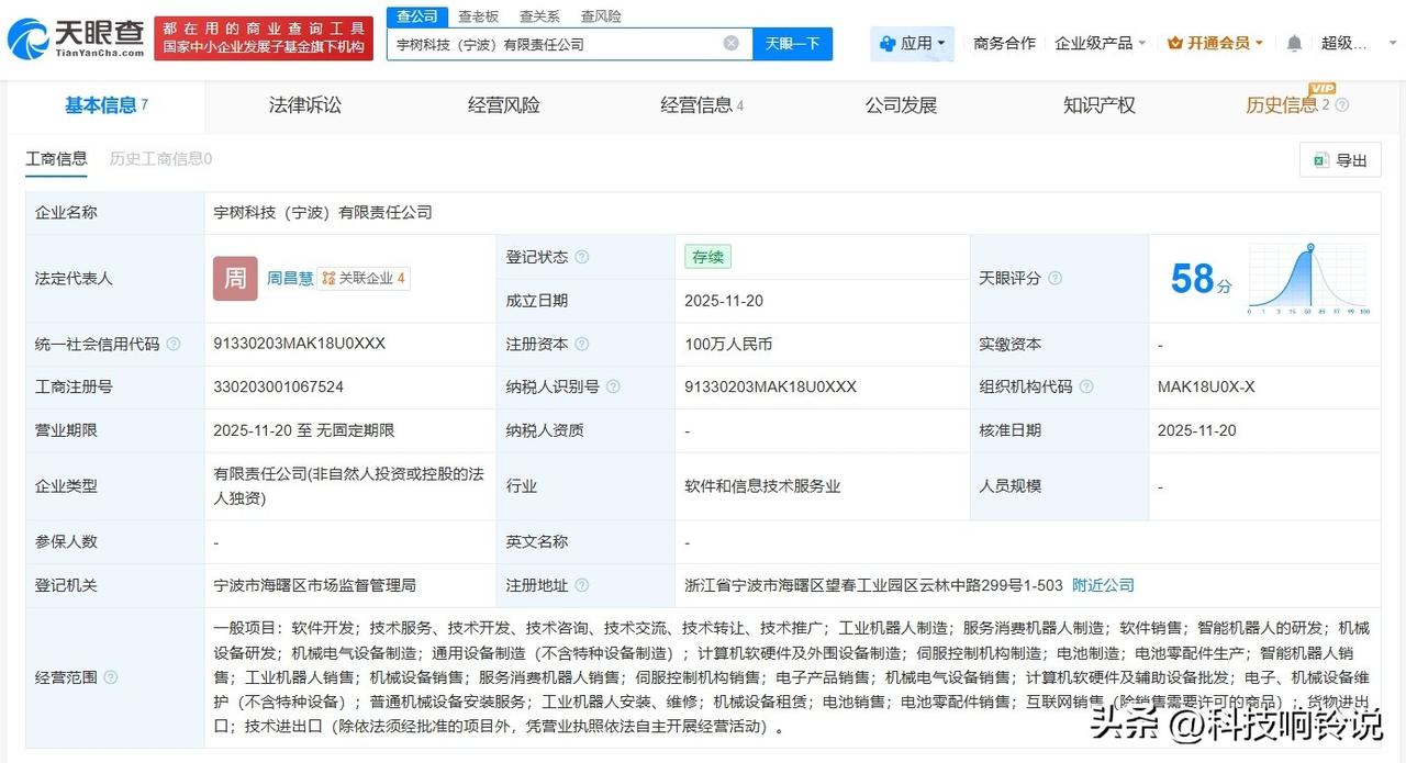 【宇树科技在宁波成立新公司 宇树科技新公司成立】 天眼查App显示,近日,宇树科技(宁波)有限责任公司成立,法定代表人为周昌慧,注册资本100万人民币,经营范围包括工业机器人制造、服务消费机器人制造、智能机器人的研发、电子产品销售等。股东信息显示,该公司由宇树科技股份有限公司全资持股。 天眼查信息: